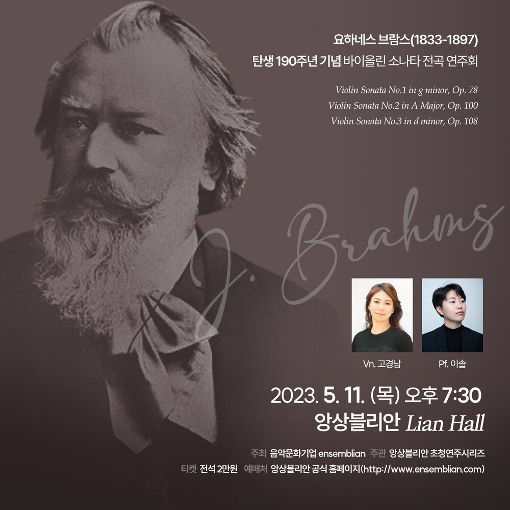 클래식 한 스푼의 고경남 대표와 앙상블리안 소속 아티스트 피아니스트 이솔이 함께 하는 브람스 탄생 190주년 기념 바이올린 손타 전곡 연주회입니다. 브람스의 바이올린 소나타는 바이올린 문헌사에서 가장 중요한 작품 중 하나 입니다. 브람스의 음악세계의 정수가 담긴 작품들을 한 자리에서 만나보세요. 앙상블리안 초청연주시리즈로 함께 합니다.