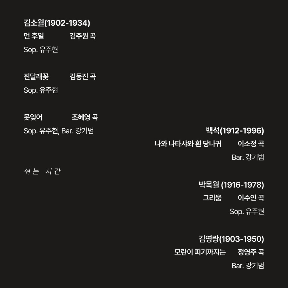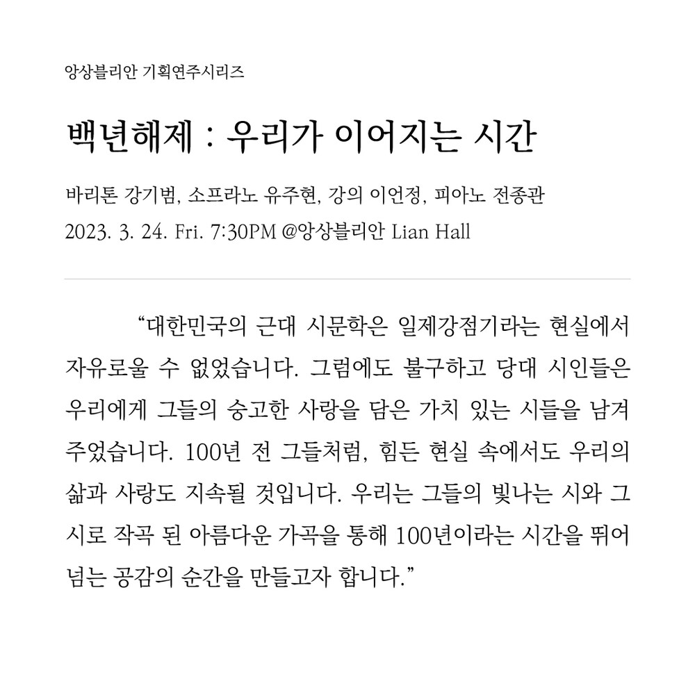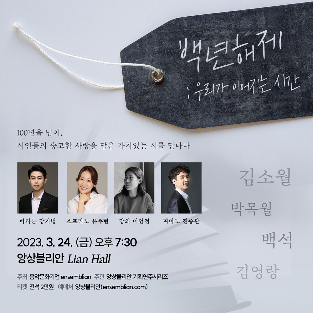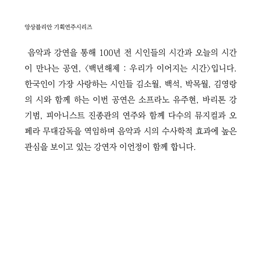음악과 강연을 통해 100년 전 시인들의 시간과 오늘의 시간이 만나는 공연, <백년해제 : 우리가 이어지는 시간>입니다. 한국인이 가장 사랑하는 시인들 김소월, 백석, 박목월, 김영랑의 시와 함께 하는 이번 공연은 소프라노 유주현, 바리톤 강기범, 피아니스트 진종관의 연주와 함께 다수의 뮤지컬과 오페라 무대감독을 역임하며 음악과 시의 수사학적 효과에 높은 관심을 보이고 있는 강연자 이언정이 함께 합니다.