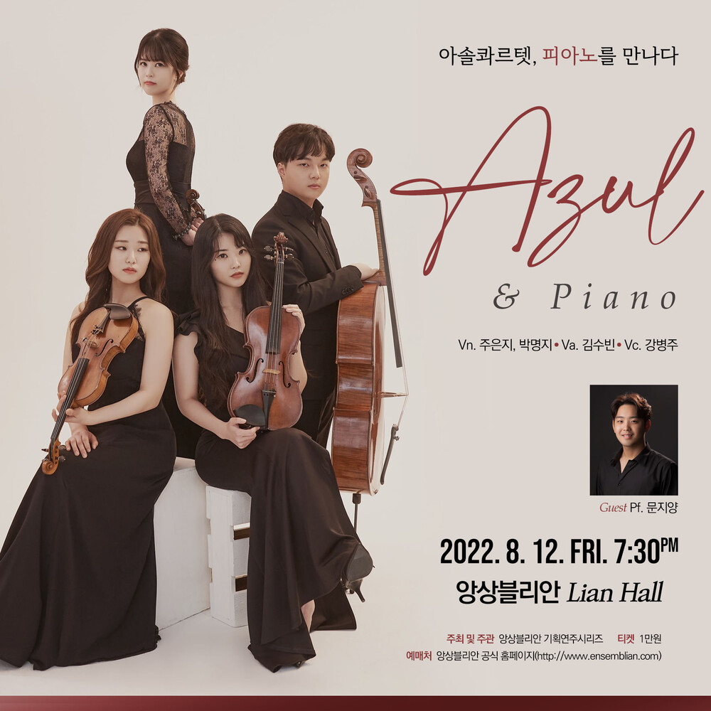 '푸르른'이라는 뜻을 가지고 있는 아솔 콰르텟! 시리즈 아티스트로 꽉 찬 프로그램을 선보이는 아솔 콰르텟의 2022년 두번째 연주입니다. 이번에는 피아니스트 문지양과 함께 <아솔 콰르텟, 피아노를 만나다>라는 주제로 공연을 선보이는데요. 지난 연주에서는 콰르텟의 매력을 시대별 다른 음악으로 선보였다면, 이번 연주는 악기 구성을 다양하게 조합하여 트리오, 콰르텟, 퀸텟을 하나의 콘서트로 즐길 수 있습니다. 자유로운 피아졸라와 반대되는 느낌의 프로코피예프와 함께 많은 분들에게 사랑받는 드뷔시의 달빛과 영화 '티파니에서 아침을' OST Moon River를 함께 편곡한 작품들도 만나볼 수 있는데요. 푸르른 청년들의 뜨거운 열정이 담긴 이번 콘서트, 앙상블리안 리안홀에서 특별한 관객이 되어주세요.