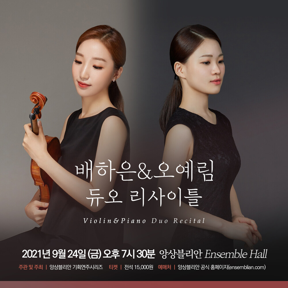 숙명여자대학교 동문인 두 연주자, 바이올리니스트 배하은과 피아니스트 오예림의 듀오 리사이틀입니다. 가장 대표적인 바이올린 소나타 작품인 모차르트와 베토벤 그리고 브람스를 한 자리에서 만나볼 수 있는 이번 콘서트에서는 두 연주자의 밀접한 호흡과 앙상블을 느끼실 수 있습니다.