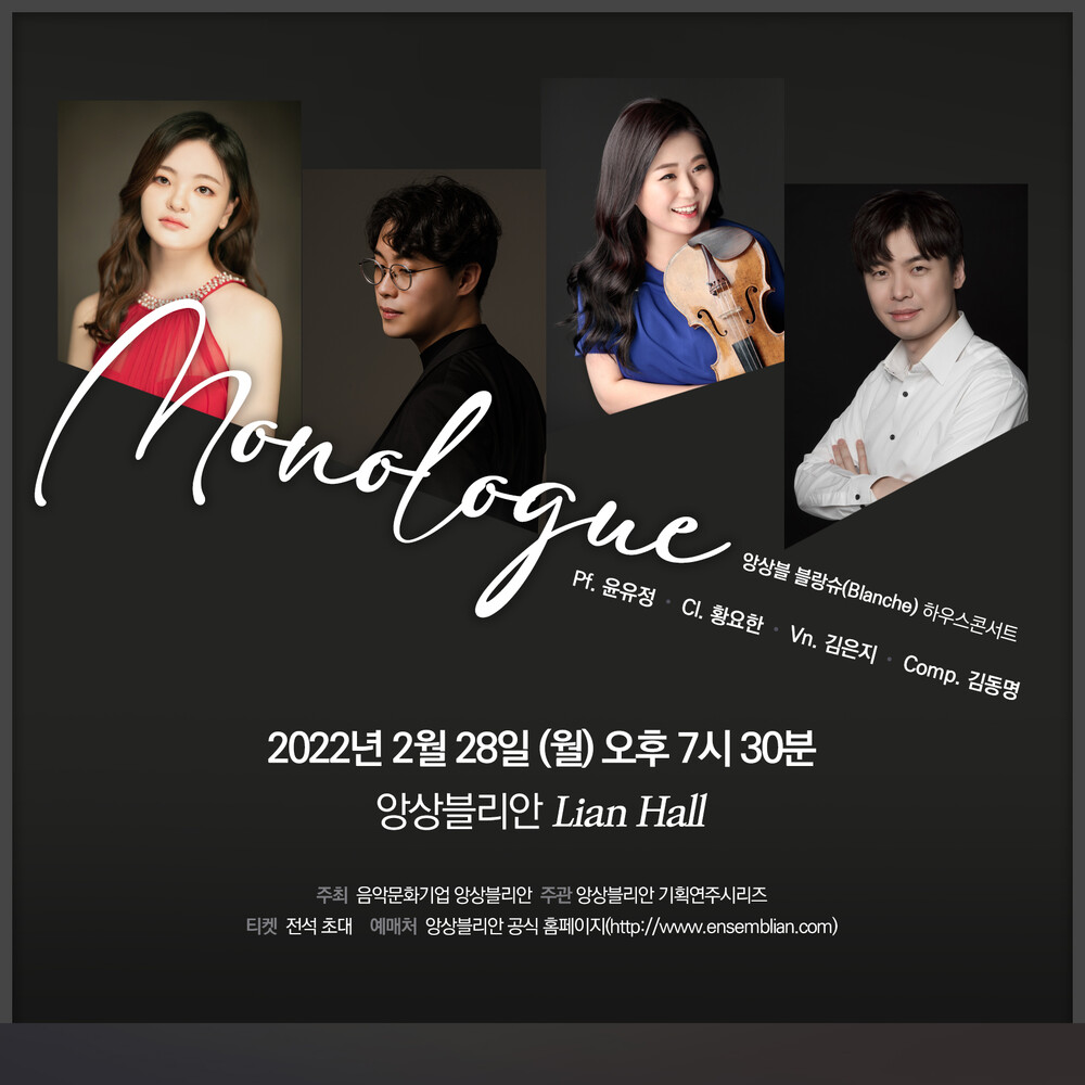 독백(Monologue), 이번 콘서트의 타이틀이자 이번 공연에서 초연되는 작곡가 김동명의 베이스 클라리넷 작품입니다. 2020-2021 대구문화재단 청년예술가로 활동했던 아티스트들이 모여 창단된 앙상블 블랑슈는 단순한 합주 뿐만 아니라 새로운 예술세계를 창조해가는 행보들을 보이고 있는데요. 특별히 이번 공연에서는 현 시대의 작곡가의 작품들로 구성되며 앙상블 블랑슈의 멤버인 작곡가 김동명의 두 작품들도 연주됩니다. 정교하고 독창적인 해석을 통해 관객에게 새로운 무대를 경험할 수 있는 기회를 선사하는 블랑슈의 모노로그. 앙상블리안에서 만나보세요.