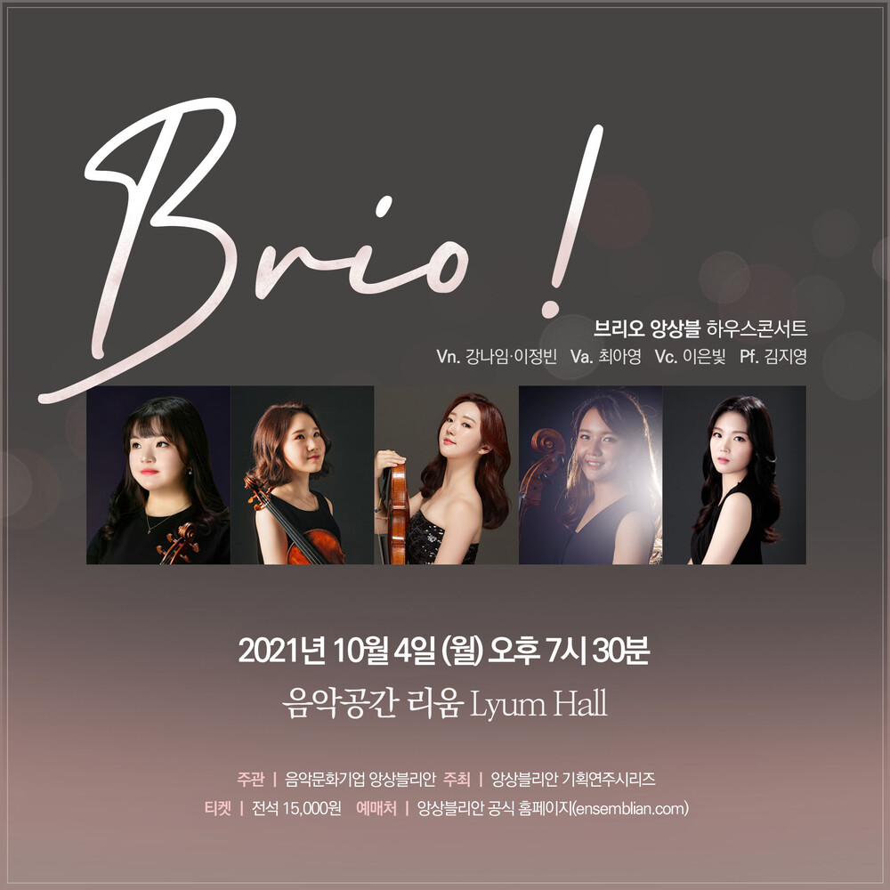 포스트 코로나로 인해 고민 많은 청년 예술가들이 계속해서 늘어가고 있습니다. 이런 상황에도 다시 한 번 깨닫는 것은 바로 '음악'을 놓치고 싶지 않다는 사실입니다. Brio(브리오)는 이태리어로 '활기 넘치는' , '쾌활한'이라는 의미입니다. 단원 모두가 음악을 하고 싶다는 열정 하나로 이 공연을 준비한 만큼 우리의 가족, 친구를 비롯한 공연에 와주신 모든 분에게 우리의 “Brio!!”가 잘 전달되기를 바랍니다. (글: 브리오 앙상블)