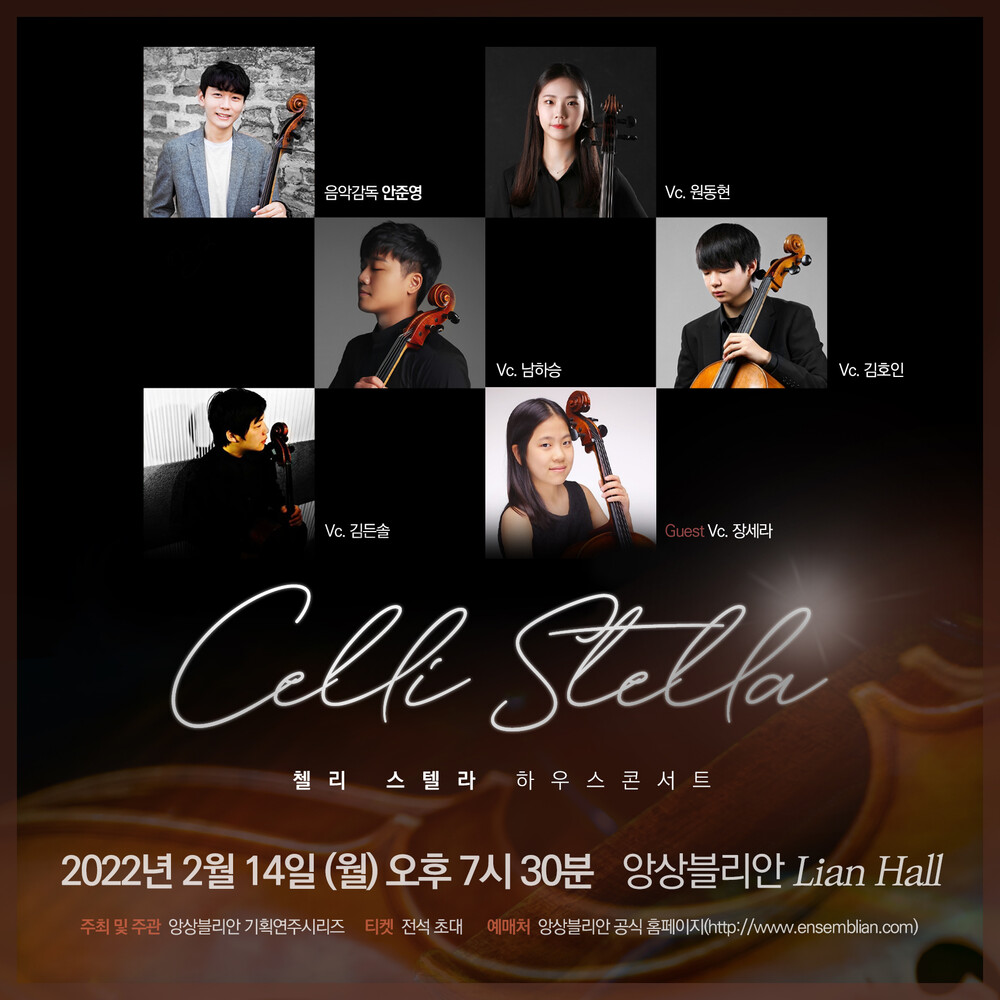 첼리스트 안준영을 음악감독으로 활동하고 있는 첼리 스텔라의 하우스콘서트입니다. 발렌타인 데이에 열리는 이번 콘서트는 첼리스트들의 대표적인 레퍼토리와 함께 2대의 첼로와 4대의 첼로로 만나는 앙상블 작품들로 이루어져 있는데요. 젊은 첼리스트 5명과 유망주 게스트 장세라 그리고 피아니스트 이총명이 함께 하는 이번 콘서트를 앙상블리안 하우스콘서트에서 만나보세요. 이번 공연은 전석 초대로 이루어집니다.