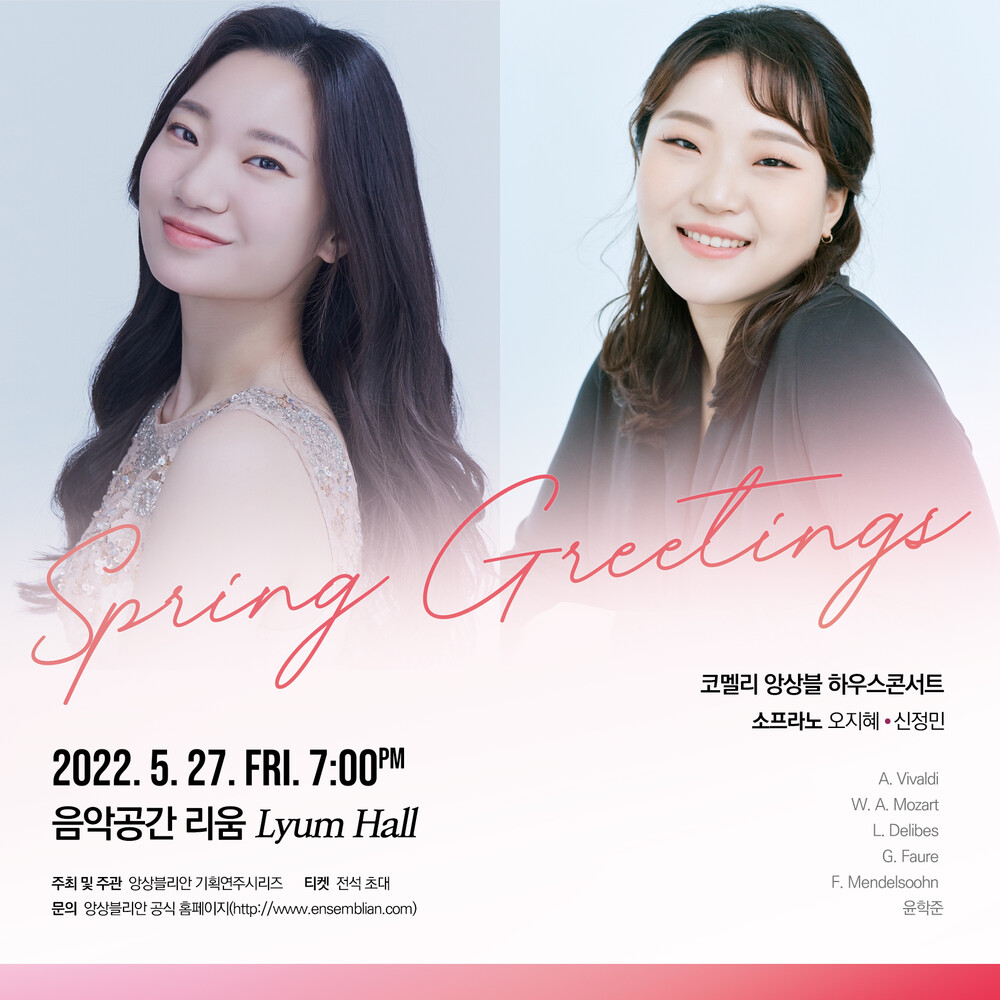코멜리 앙상블은 이름의 뜻처럼 어여쁘고 아름다운 두 소프라노가 감각적인 음악을 선보이는 팀입니다. 창단 후 처음으로 관객을 만나는 이번 연주에서는 소프라노 오지혜, 신정민이 다양한 레퍼토리로 관객을 만납니다. 이번 공연은 음악공간 리움에서 이루어지며 당일 라이브 스트리밍이 함께 진행됩니다. 앙상블리안에서 만나보세요!