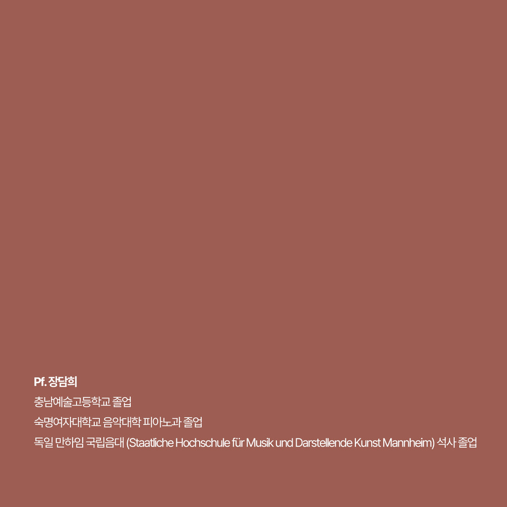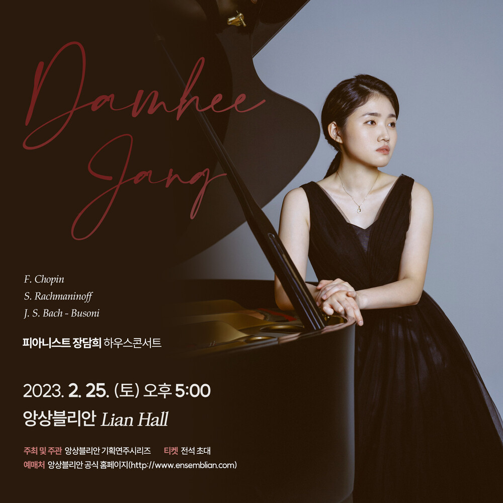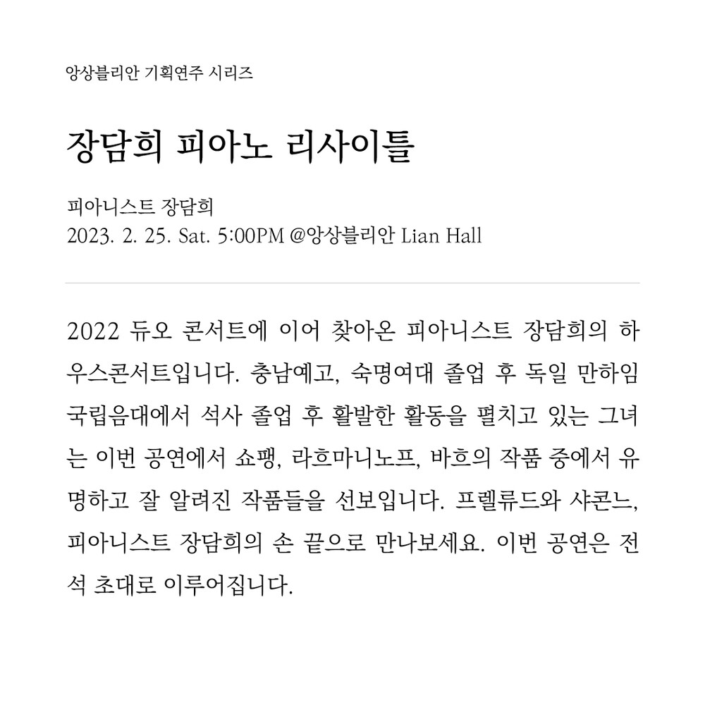 2022 듀오 콘서트에 이어 찾아온 피아니스트 장담희의 하우스콘서트입니다. 충남예고, 숙명여대 졸업 후 독일 만하임국립음대에서 석사 졸업 후 활발한 활동을 펼치고 있는 그녀는 이번 공연에서 쇼팽, 라흐마니노프, 바흐의 작품 중에서 유명하고 잘 알려진 작품들을 선보입니다. 프렐류드와 샤콘느, 피아니스트 장담희의 손 끝으로 만나보세요. 이번 공연은 전석 초대로 이루어집니다.