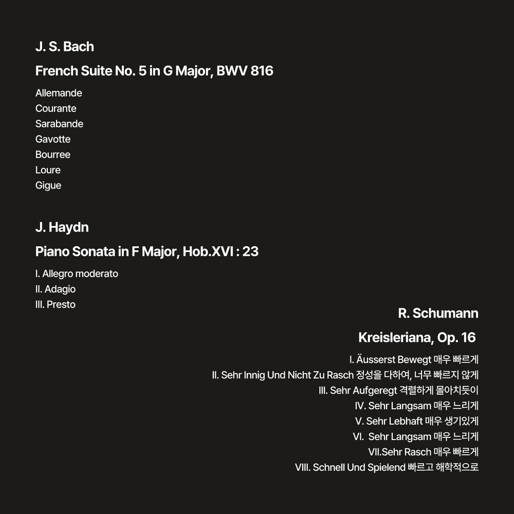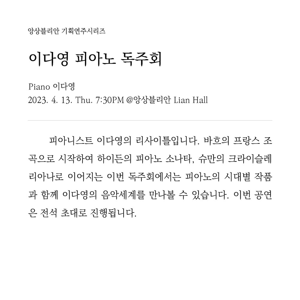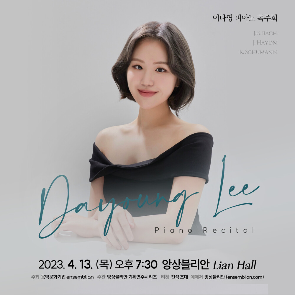 피아니스트 이다영의 리사이틀입니다. 바흐의 프랑스 조곡으로 시작하여 하이든의 피아노 소나타, 슈만의 크라이슬레리아나로 이어지는 이번 독주회에서는 피아노의 시대별 작품과 함께 이다영의 음악세계를 만나볼 수 있습니다. 이번 공연은 전석 초대로 진행됩니다.