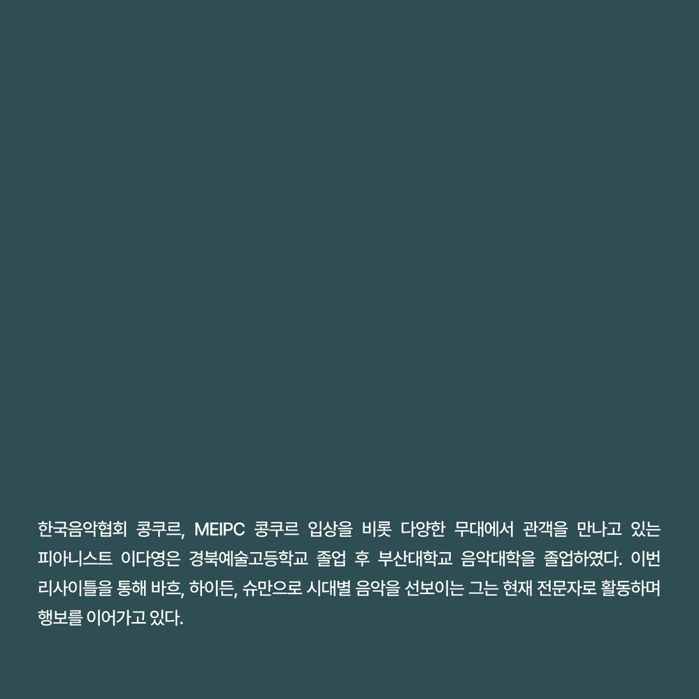 한국음악협회 콩쿠르, MEIPC 콩쿠르 입상을 비롯 다양한 무대에서 관객을 만나고 있는 피아니스트 이다영은 경북예술고등학교 졸업 후 부산대학교 음악대학을 졸업하였다. 이번 리사이틀을 통해 바흐, 하이든, 슈만으로 시대별 음악을 선보이는 그는 현재 전문자로 활동하며 행보를 이어가고 있다.