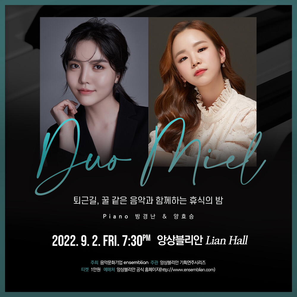 예원학교부터 서울대학교까지 함께 다닌 동문인 두 피아니스트. 듀오 미엘의 하우스콘서트입니다. 하우스콘서트이지만 정말 알찬 프로그램으로 꽉 짜여져 있는데요. 고된 퇴근길, 꿀 같은 음악을 선사할 두 피아니스트의 휴식의 밤. 바쁘고 번잡하지만 느긋한 시간을 보낼 수 있는 앙상블리안에서 함께 합니다. 피아니스트 방경난, 양효승을 만나보세요.