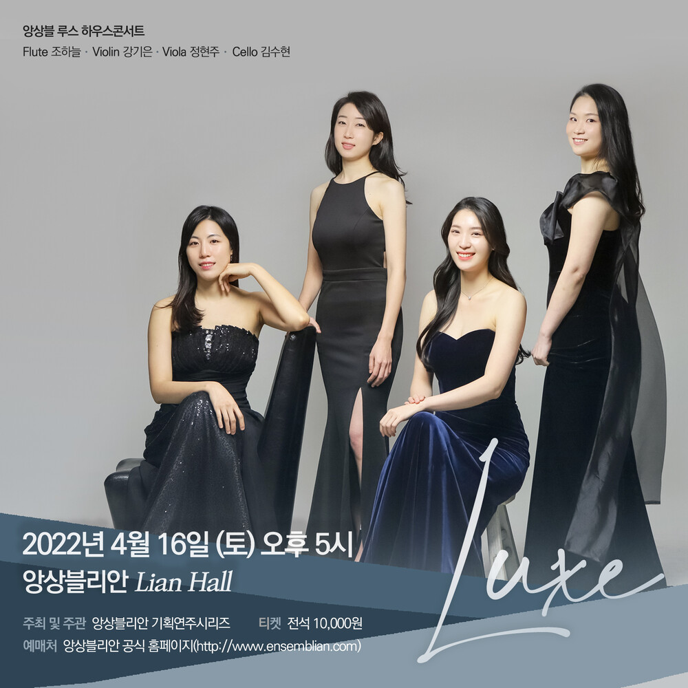 '빛'이라는 뜻을 지닌 앙상블 루스의 하우스콘서트입니다. 10대부터 친하게 지낸 네 명의 연주자가 모여 이룬 루스는 세라믹팔레스 콩쿨 3위를 비롯해 찾아가는 도서관 연주 등으로 활발한 활동을 펼치는 신진 앙상블인데요. 현악 3중주와 플루티스트가 함께 하는 루스는 이번 콘서트에서 보로딘 현악 4중주와 드보르작의 유명한 4중주, '아메리카'를 선보입니다. 앙상블리안에서 만나보세요.