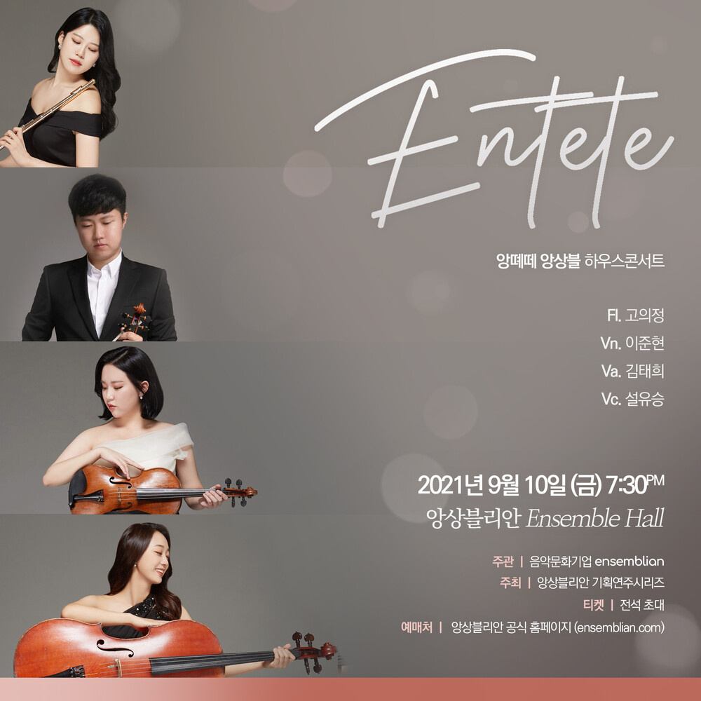 국민대학교 동문으로 구성된 앙떼떼 앙상블의 하우스콘서트입니다. 이번 연주는 바이올린 두 대와 비올라, 첼로로 이루어진 일반적인 스트링콰르텟에서 벗어나 플루티스트와 함께 하는 다소 새로운 구성으로 이루어져 있는데요. 모차르트의 플루트 콰르텟 곡과 슈베르트의 스트링 트리오. 그리고 드보르작의 가장 유명한 스트링 콰르텟 곡 'American'을 앙떼떼 앙상블만의 감성으로 만나보세요.