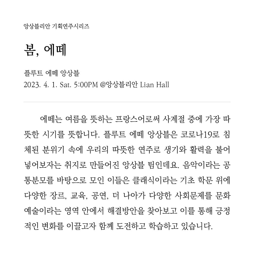 에떼는 여름을 뜻하는 프랑스어로써 사계절 중에 가장 따뜻한 시기를 뜻합니다. 플루트 에떼 앙상블은 코로나19로 침체된 분위기 속에 우리의 따뜻한 연주로 생기와 활력을 불어 넣어보자는 취지로 만들어진 앙상블 팀인데요. 음악이라는 공통분모를 바탕으로 모인 이들은 클래식이라는 기초 학문 위에 다양한 장르, 교육, 공연, 더 나아가 다양한 사회문제를 문화예술이라는 영역 안에서 해결방안을 찾아보고 이를 통해 긍정적인 변화를 이끌고자 함께 도전하고 학습하고 있습니다. 연주자 초대석으로 이루어지는 이번 공연은 에떼 앙상블 멤버들과 피아니스트 목솔이가 함께 합니다.