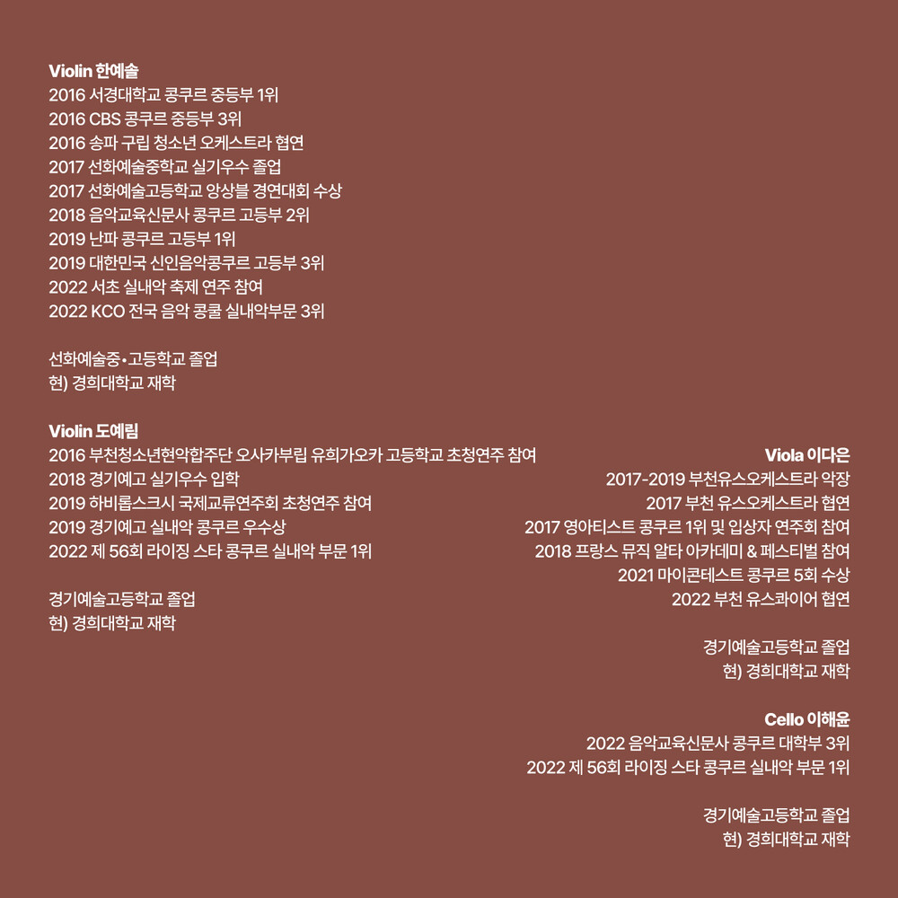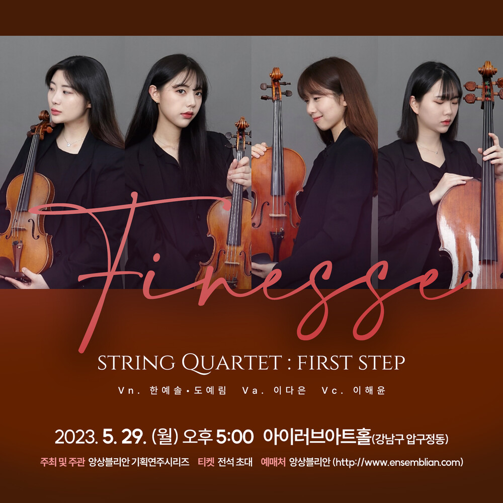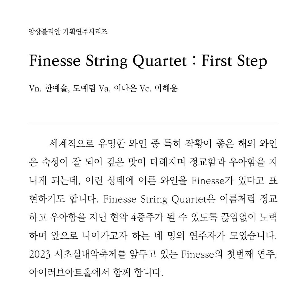 세계적으로 유명한 와인중 특히 작황이 좋은 해의 와인은 숙성이 잘 되어 깊은 맛이 더해지며 정교함과 우아함을 지니게 되는데, 이런 상태에 이른 와인을 Finesse가 있다고 표현하기도 합니다. Finesse String Quartet은 이름처럼 정교하고 우아함을 지닌 현악 4중주가 될 수 있도록 끊임없이 노력하며 앞으로 나아가고자 하는 네 명의 연주자가 모였습니다. 2023 서초실내악축제를 앞두고 있는 Finesse의 첫번째 연주, 아이러브아트홀에서 함께 합니다.