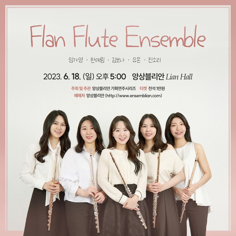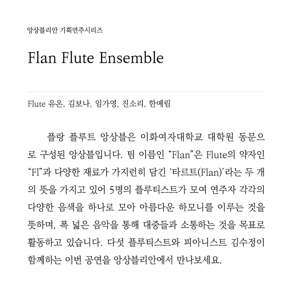 플랑 플루트 앙상블은 이화여자대학교 대학원 동문으로 구성된 앙상블입니다. 팀 이름인 “Flan”은 Flute의 약자인 “Fl”과 다양한 재료가 가지런히 담긴 ‘타르트(Flan)’라는 두 개의 뜻을 가지고 있어 5명의 플루티스트가 모여 연주자 각각의 다양한 음색을 하나로 모아 아름다운 하모니를 이루는 것을 뜻하며, 폭 넓은 음악을 통해 대중들과 소통하는 것을 목표로 활동하고 있습니다. 다섯 플루티스트와 피아니스트 김수정이 함께하는 이번 공연을 앙상블리안에서 만나보세요.