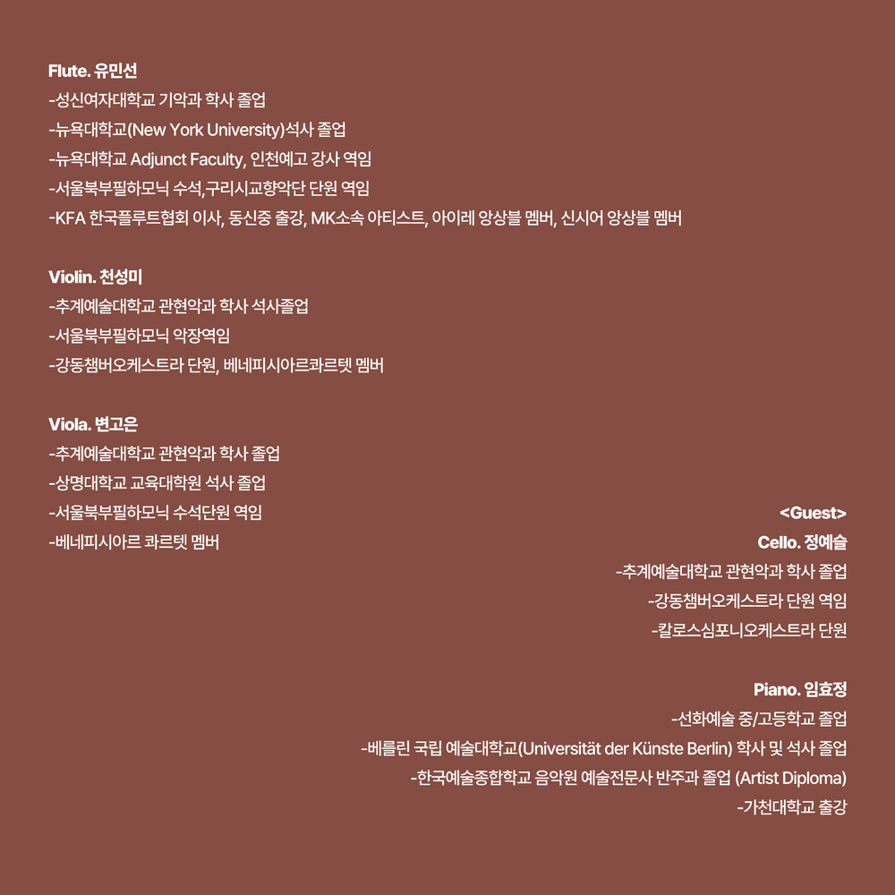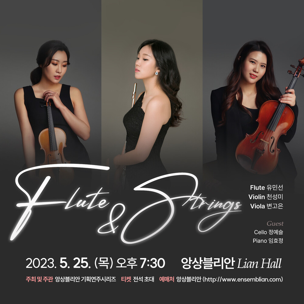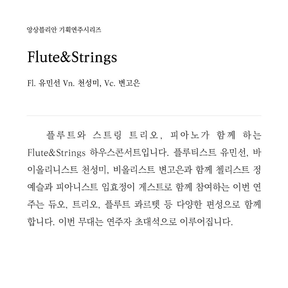 플루트와 스트링 트리오, 피아노가 함께 하는 Flute&Strings 하우스콘서트입니다. 플루티스트 유민선, 바이올리니스트 천성미, 비올리스트 변고은과 함께 첼리스트 정예슬과 피아니스트 임효정이 게스트로 함께 참여하는 이번 연주는 듀오, 트리오, 플루트 콰르텟 등 다양한 편성으로 함께 합니다. 이번 무대는 연주자 초대석으로 이루어집니다.