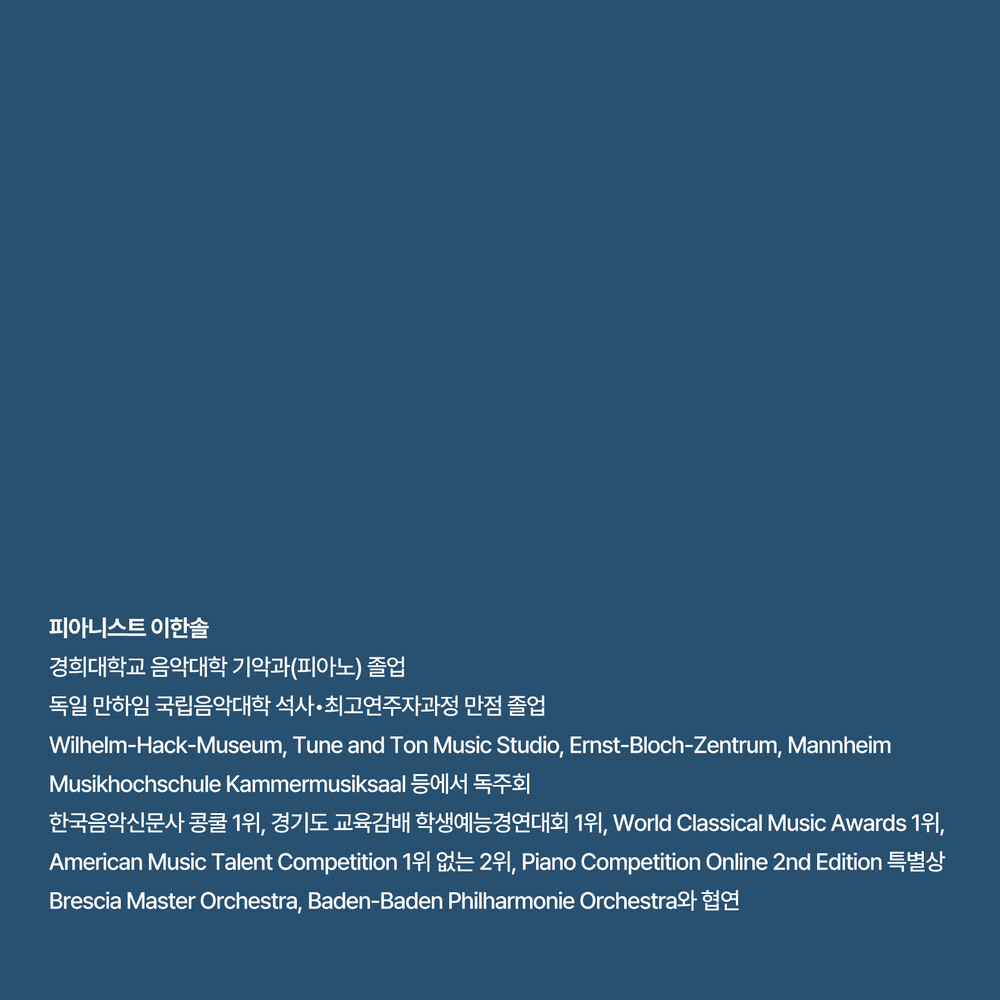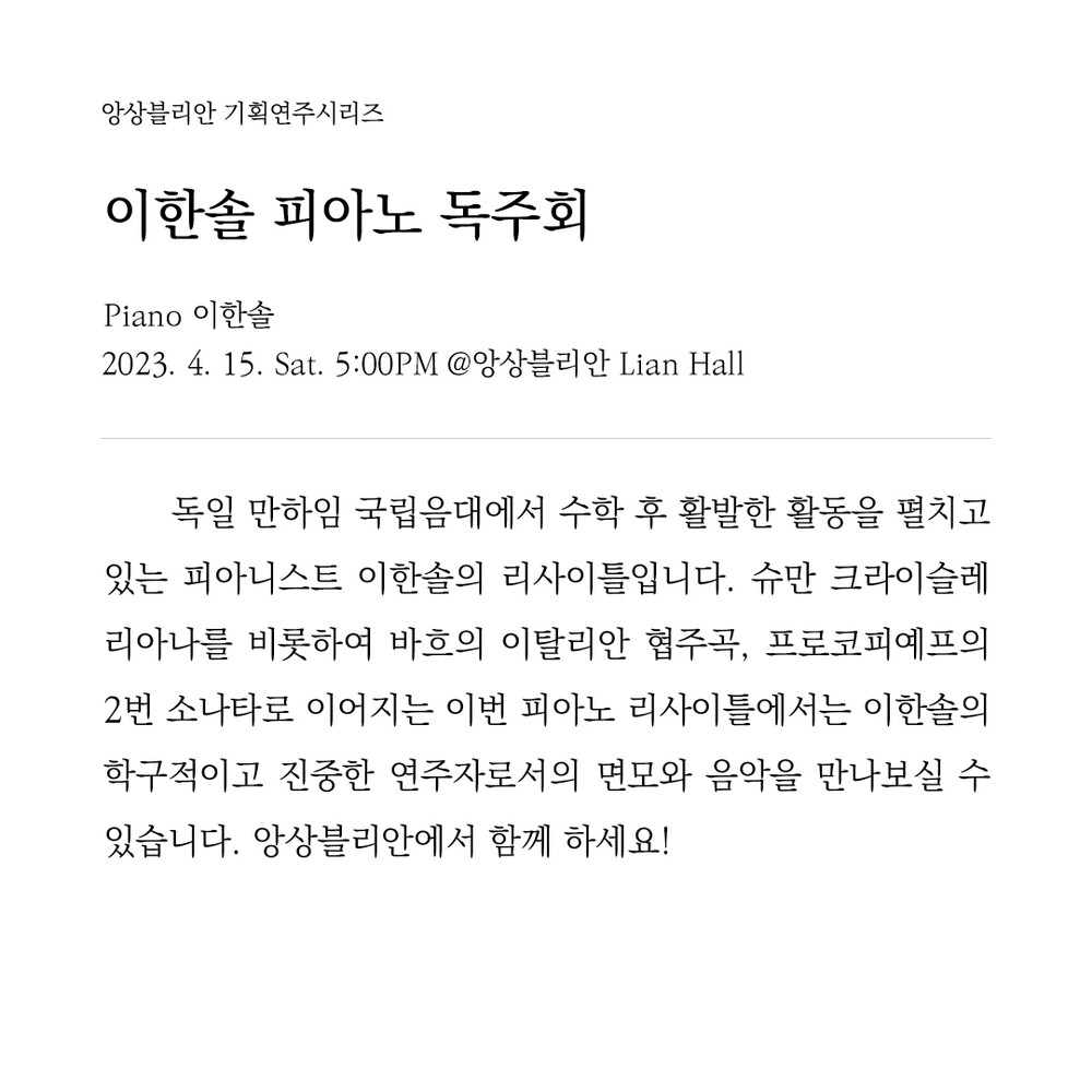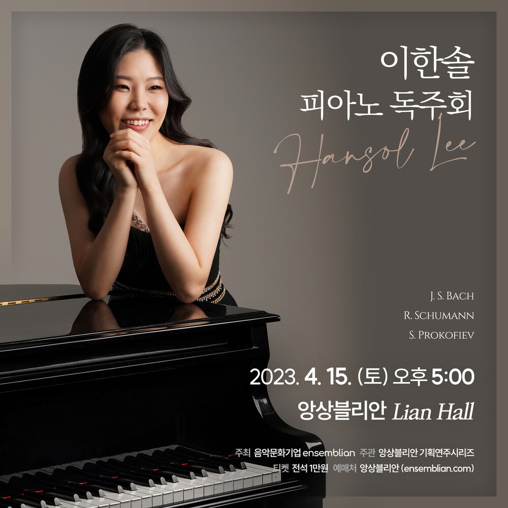 독일 만하임 국립음대에서 수학 후 활발한 활동을 펼치고 있는 피아니스트 이한솔의 리사이틀입니다. 슈만 크라이슬레리아나를 비롯하여 바흐의 이탈리안 협주곡, 프로코피예프의 2번 소나타로 이어지는 이번 피아노 리사이틀에서는 이한솔의 학구적이고 진중한 연주자로서의 면모와 음악을 만나보실 수 있습니다. 앙상블리안에서 함께 하세요!