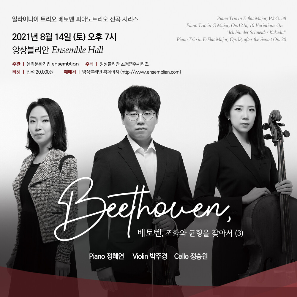 2020년부터 2021년에 걸쳐 진행되고 있는 베토벤, 조화와 균형을 찾아서 시리즈의 세번째 연주 입니다. 국내 최초로 베토벤이 피아노 트리오를 위해 작곡한 모든 곡들 연주에 도전하는 일라이나이 트리오는 <월간 스트라드> 2020년 12월호의 베토벤 탄생 250주년을 기념하여 소개되었으며, 2021년 12월까지 그 대장정을 마칠 예정으로 시리즈를 진행하고 있습니다.