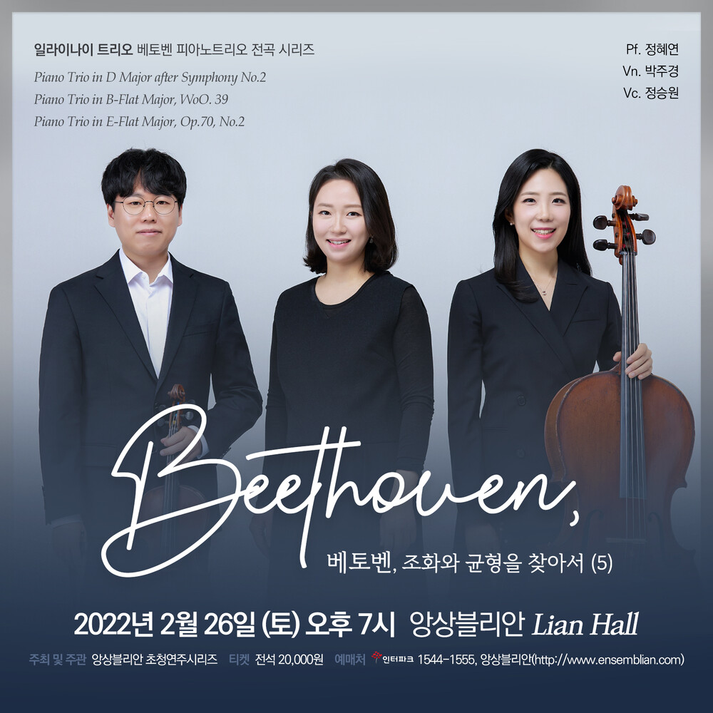 2020년 말부터 이어진 국내 최초 베토벤 트리오를 위한 전곡 작품에 도전하는 일라이나이 트리오의 마지막 시리즈입니다. 베토벤의 교향곡 2번을 그가 직접 편곡한 작품과 더불어 초기 작품과 함께 베토벤의 친구인 안토니오 브렌타노의 딸을 위해 작곡한 WoO. 39번과 함께 베토벤에게 종신연금을 받을 수 있도록 힘써주었던 마리 폰 에르되디 백작부인에게 헌정된 작품번호 70-2번으로 대장정의 막을 내립니다.