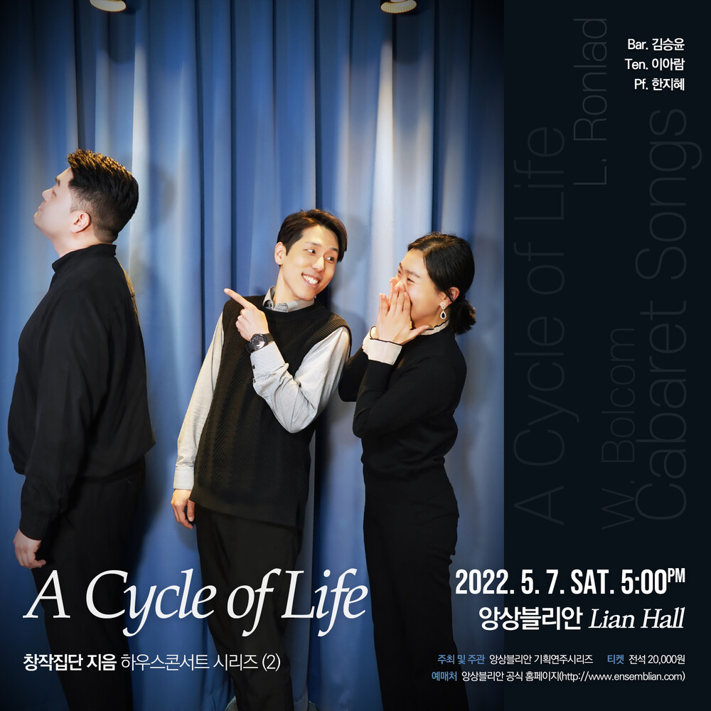 가곡을 한 편의 드라마로 풀어내는 팀. 창작집단 지음의 두번째 시리즈입니다. 베이스바리톤 김승윤과 피아니스트이자 음악감독 한지혜와 더불어 테너 이아람이 함께 하는 이번 콘서트에서는 많은 연주자에게 사랑받는 대중적인 가곡, 로날드의 <A Cycle of LIfe>와 볼콤의 <Caberet Songs>를 한 편의 서사로 풀어냅니다. 리뉴얼하여 더욱 새로워진 음악소극장, 앙상블리안에서 만나보세요.
