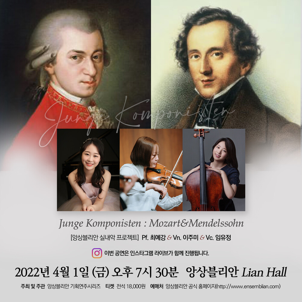 2022년까지 이어지는 앙상블리안 실내악 프로젝트! 젊은 작곡가들이라는 주제의 Junge Komponisten를 젊은 음악가들이 연주합니다! 모차르트와 멘델스존의 피아노 트리오 작품이 연주되는 이번 콘서트에서는 2021 앙상블리안 실내악프로젝트 피아니스트 공모 당시 가장 많은 팀의 선택을 받았던 피아니스트 최예강과 소속 아티스트 앙상블 조이너스의 바이올리니스트 이주미, 2021 하우스콘서트 중 주목할 만한 콘서트 중 하나였던 베네 트리오의 첼리스트 임유정이 연주합니다. 이번 콘서트는 인스타그램 라이브가 함께 이루어집니다.
