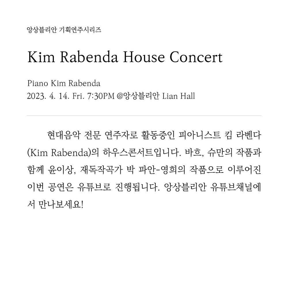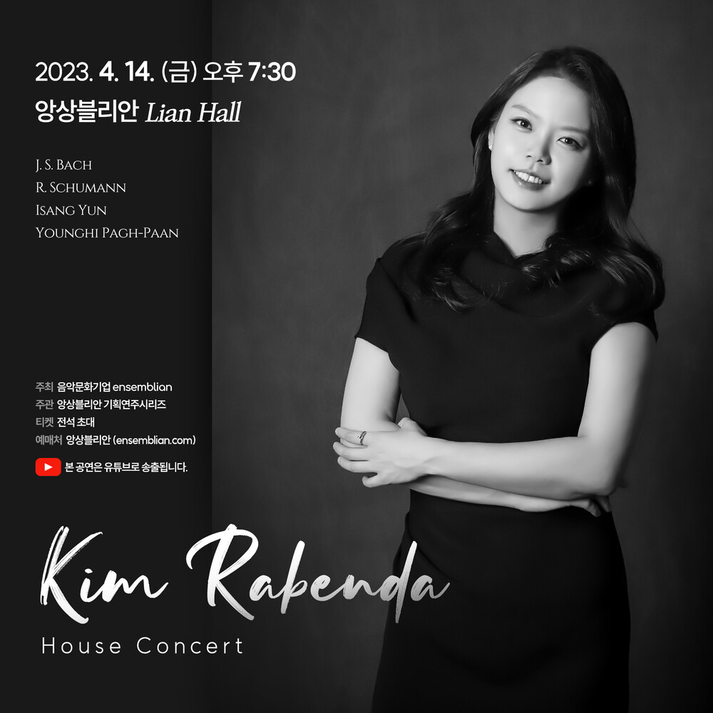 현대음악 전문 연주자로 활동중인 피아니스트 킴 라벤다(Kim Rabenda)의 하우스콘서트입니다. 바흐, 슈만의 작품과 함께 윤이상, 재독작곡가 박 파안-영희의 작품으로 이루어진 이번 공연은 유튜브로 진행됩니다. 앙상블리안 유튜브채널에서 만나보세요!