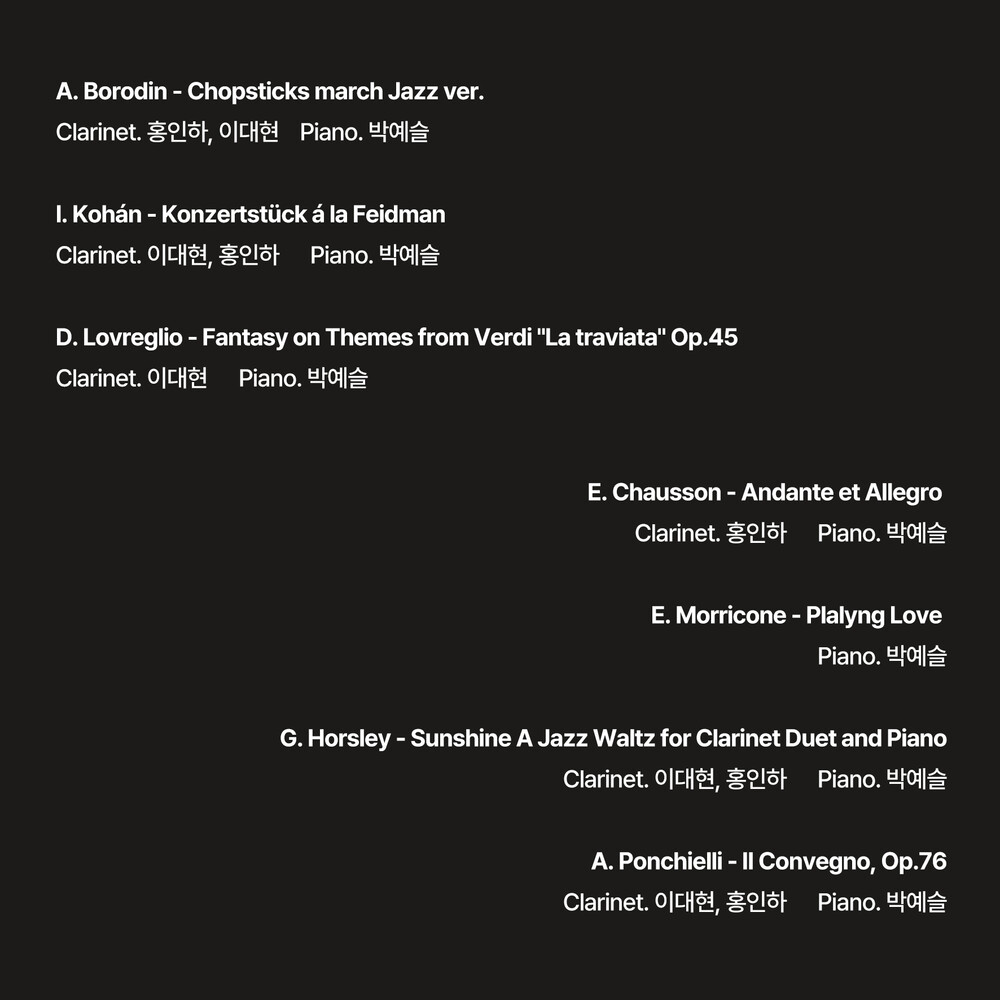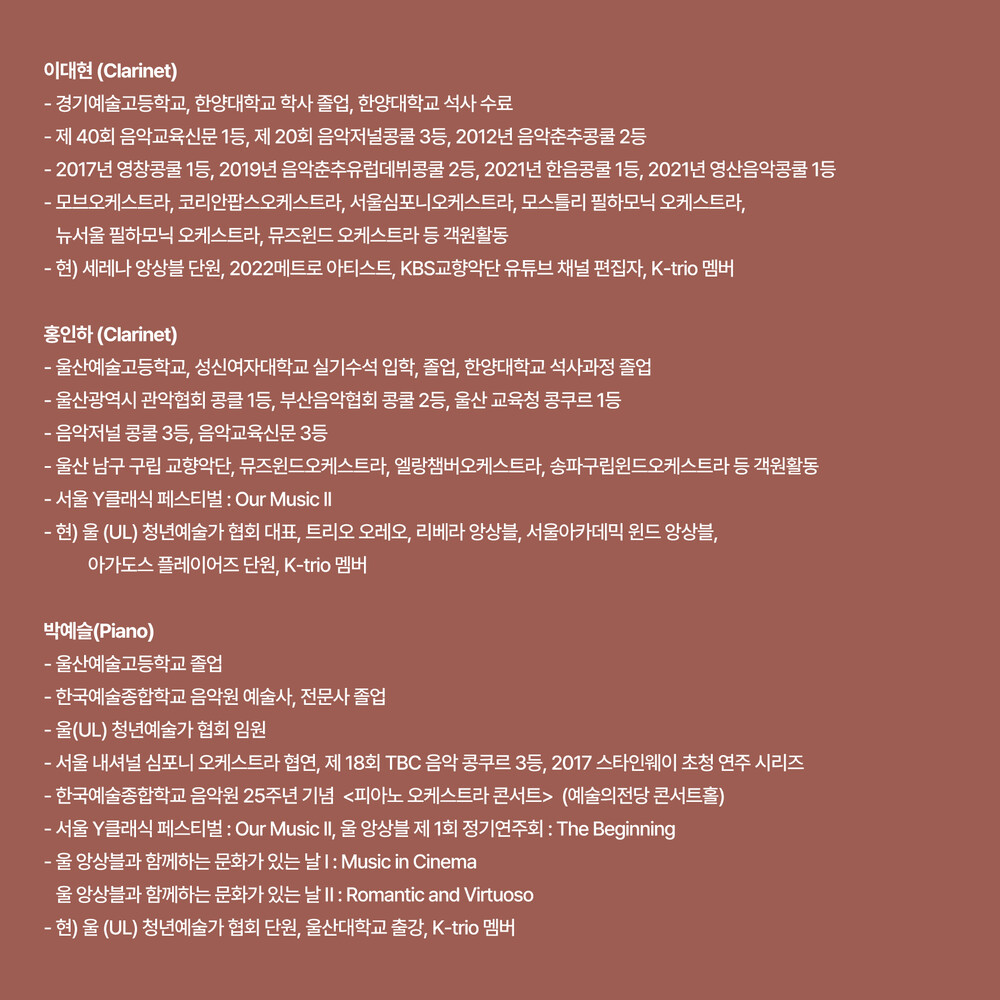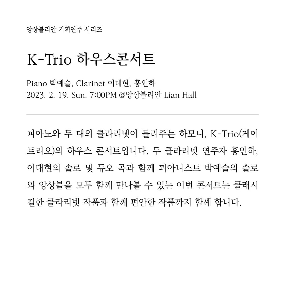 피아노와 두 대의 클라리넷이 들려주는 하모니, K-Trio(케이 트리오)의 하우스 콘서트입니다. 두 클라리넷 연주자 홍인하, 이대현의 솔로 및 듀오 곡과 함께 피아니스트 박예슬의 솔로와 앙상블을 모두 함께 만나볼 수 있는 이번 콘서트는 클래시컬한 클라리넷 작품과 함께 편안한 작품까지 함께 합니다.
