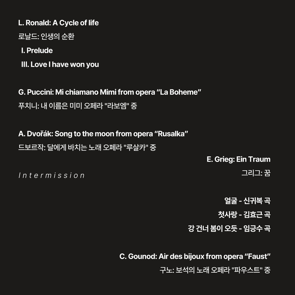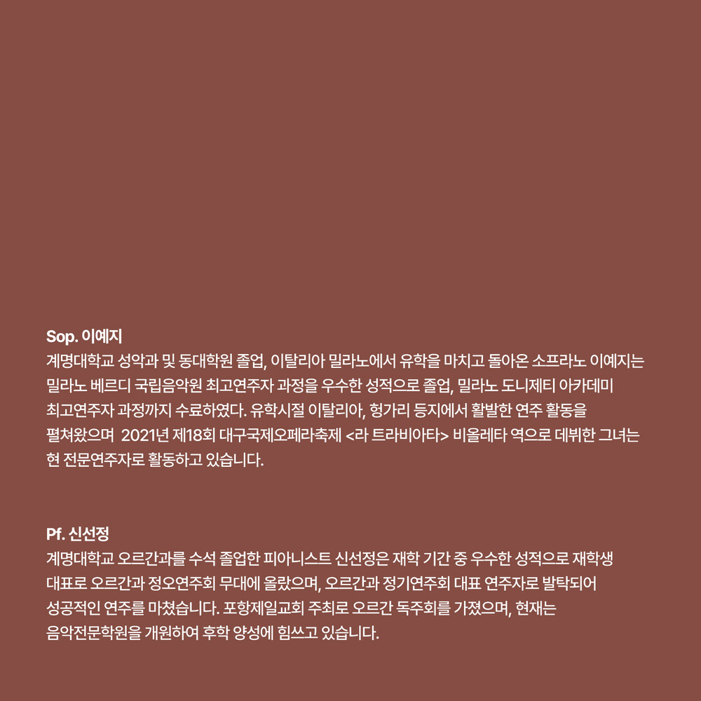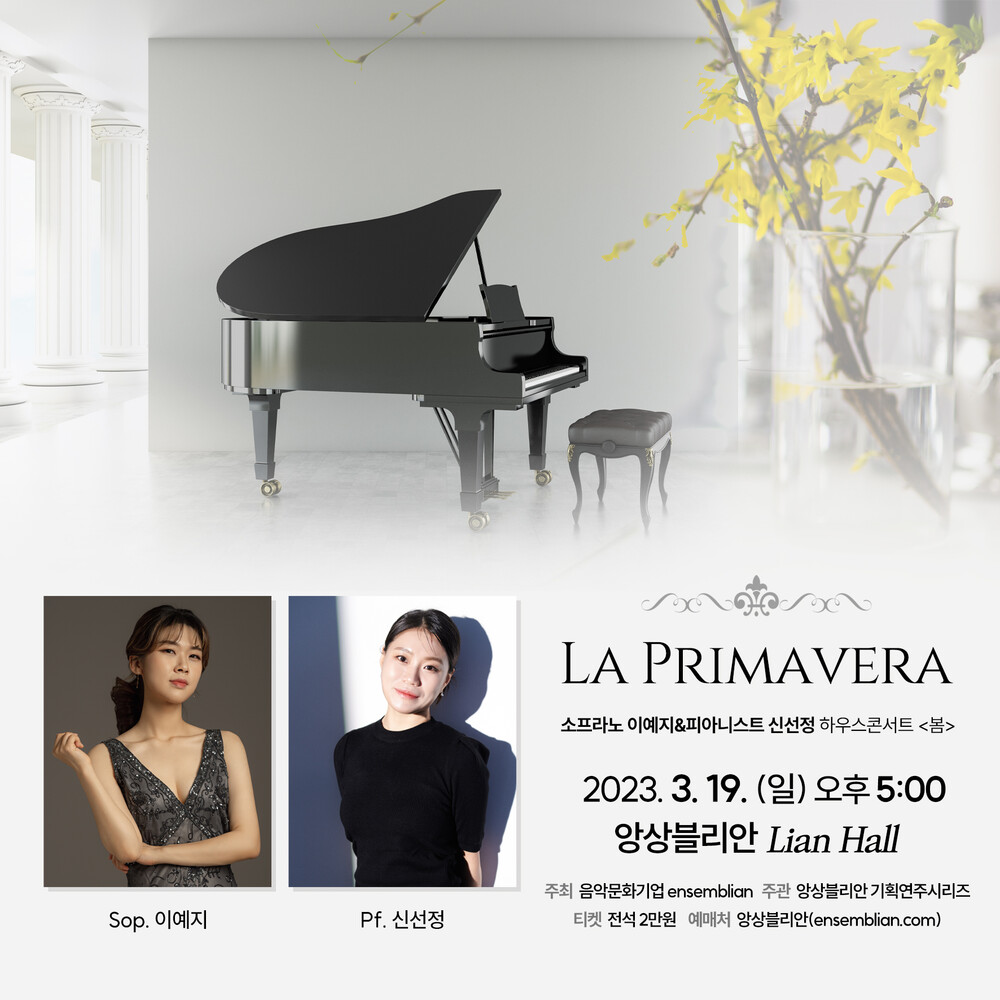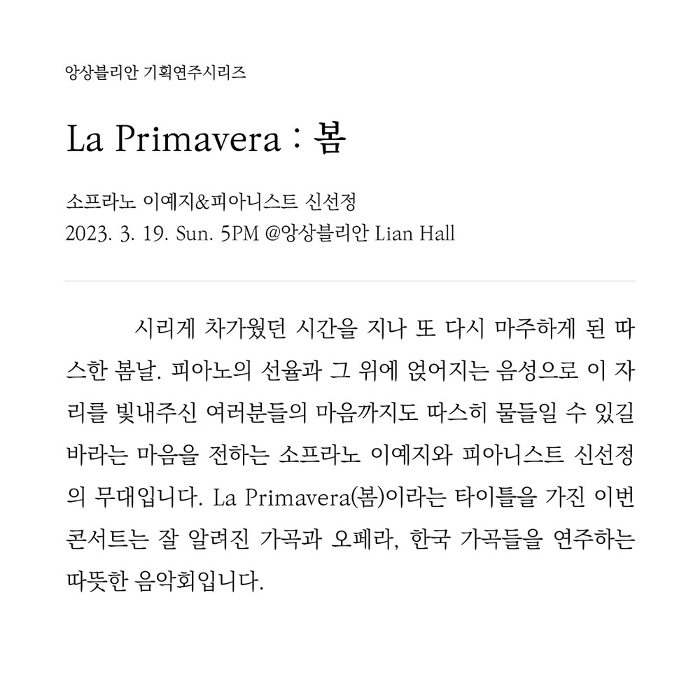 시리게 차가웠던 시간을 지나 또 다시 마주하게 된 따스한 봄날. 피아노의 선율과 그 위에 얹어지는 음성으로 이 자리를 빛내주신 여러분들의 마음까지도 따스히 물들일 수 있길 바라는 마음을 전하는 소프라노 이예지와 피아니스트 신선정의 무대입니다. La Primavera(봄)이라는 타이틀을 가진 이번 콘서트는 잘 알려진 가곡과 오페라, 한국 가곡들을 연주하는 따뜻한 음악회입니다.