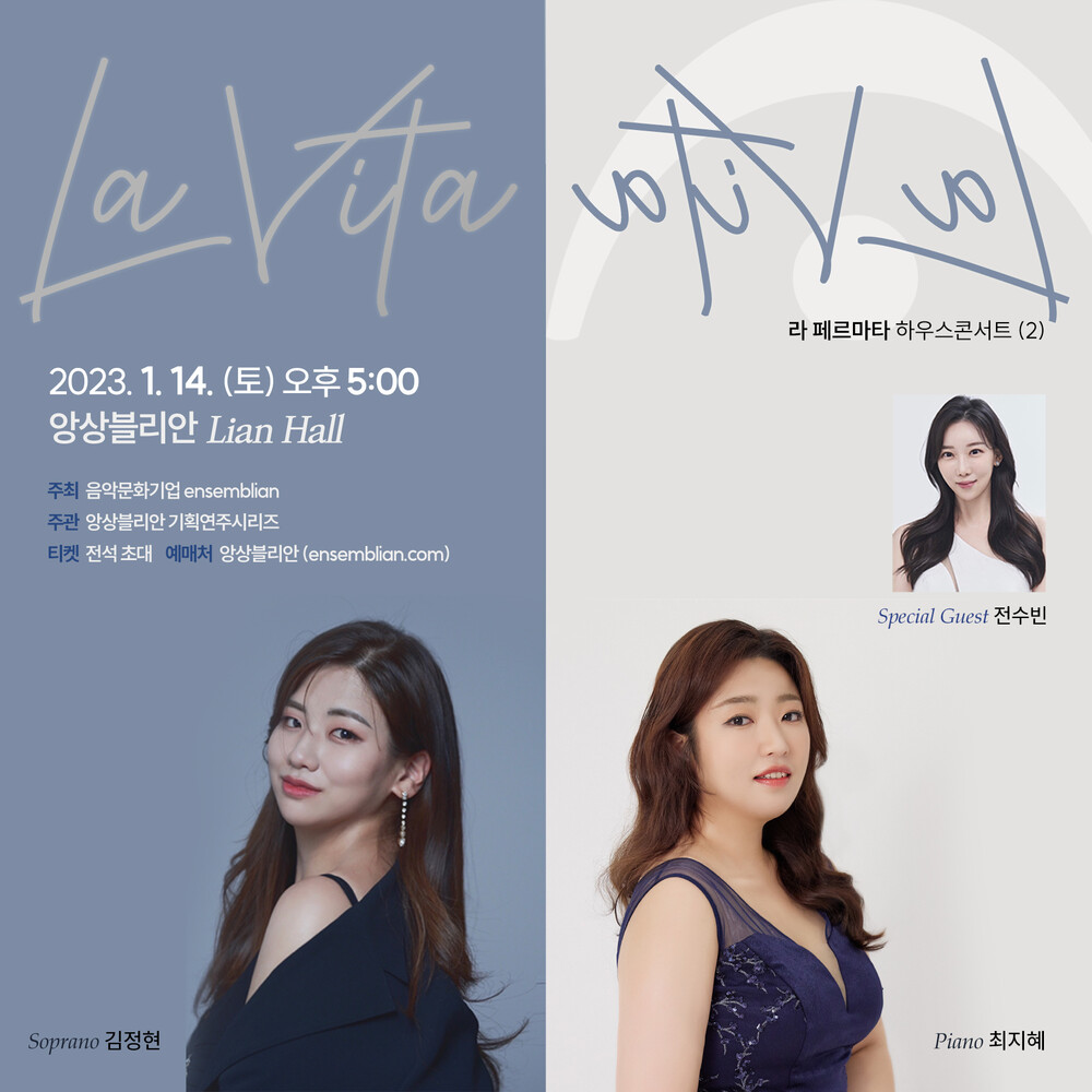 2022년에 이어 두번째로 찾아오는 [라 페르마타] 콘서트입니다. 소프라노 김정현과 피아니스트 최지혜, 그리고 게스트 전수빈이 함께 하는 이번 공연은 1부에서 다양한 가곡과 2부의 아리아들로 함께 합니다. 인생(La Vita)에 대해 노래하는 두 연주자, 앙상블리안에서 만나보세요. 이번 공연은 홈페이지에서 초대석으로 만나보실 수 있습니다.