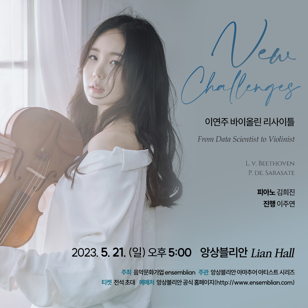 Data Scientist(데이터 사이언티스트)에서 Violinist(바이올리니스트)로 스스로를 변화시키고 있는 아티스트 이연주의 무대입니다. 아마추어 아티스트로 시작하여 미국 피바디 음대로의 진학을 앞두고 있는 그녀는 이번 공연에서 베토벤 바이올린 협주곡과 '봄' 소나타, 사라사테의 '찌고이네르바이젠'을 선보입니다. 전석 초대로 이루어지는 새로운 도전의 공연, 앙상블리안 상주 피아니스트 김희진과 바이올리니스트 이연주가 함께 합니다.