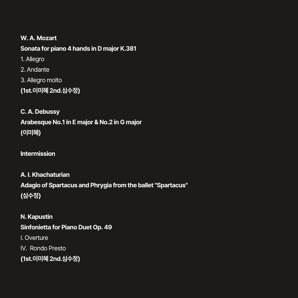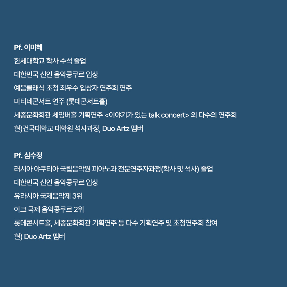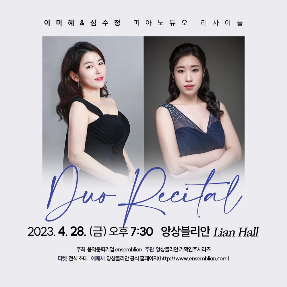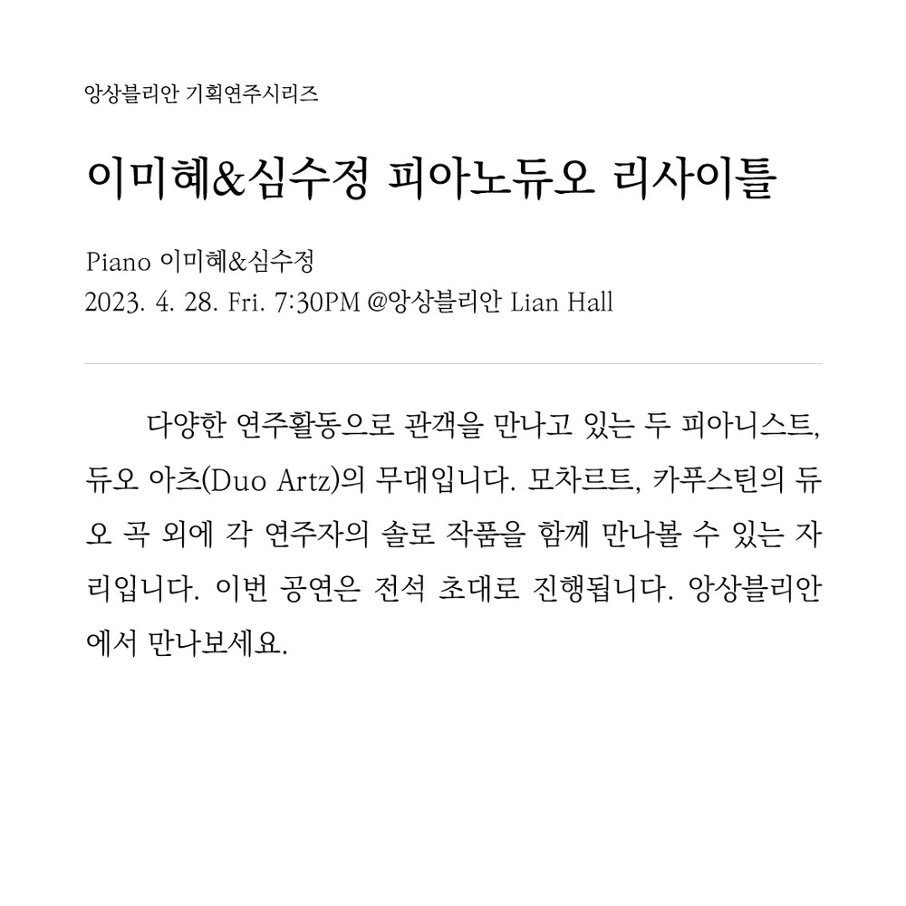 다양한 연주활동으로 관객을 만나고 있는 두 피아니스트, 듀오 아츠(Duo Artz)의 무대입니다. 모차르트, 카푸스틴의 듀오 곡 외에 각 연주자의 솔로 작품을 함께 만나볼 수 있는 자리입니다. 이번 공연은 전석 초대로 진행됩니다. 앙상블리안에서 만나보세요.