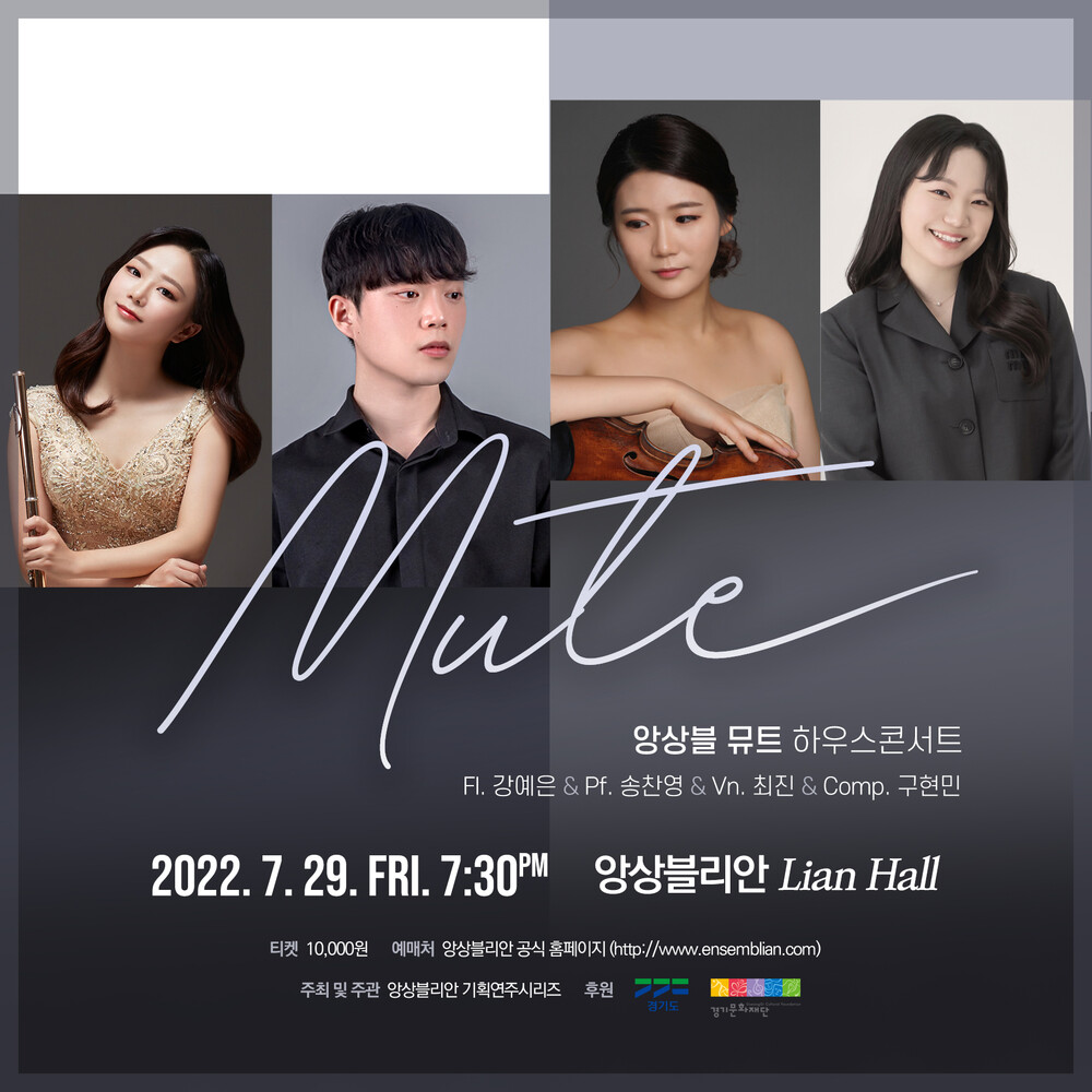 2021-22 앙상블리안 하우스콘서트에서 단연코 돋보이는 시리즈 아티스트, 앙상블 뮤트의 무대입니다. 뮤직 트리오의 줄임말인 뮤트는 바이올린, 플루트, 피아노 트리오와 작곡가로 이루어진 팀인데요. 장르를 넘나드는 부드러운 무대를 선보이는 뮤트는 이번 콘서트에서 경기문화재단의 후원을 받아 무대를 선보입니다.