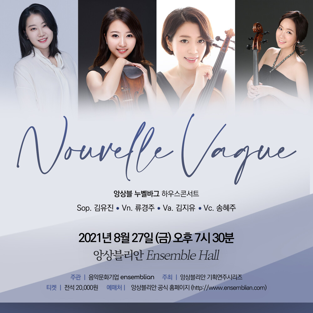 프랑스어로 새로운 물결(New Wave)라는 뜻을 가진 누벨바그(Nouvelle Vague)의 앙상블리안 첫 하우스콘서트입니다. 소프라노와 현악기 주자들로 구성된 누벨바그는 클래식 음악계에 새로운 영향을 미치겠다는 강한 의지를 가지고 있는 팀인데요. 성악곡부터 기악곡, 데일리 클래식부터 심도있는 음악까지 다양한 레퍼토리를 선보일 예정입니다.