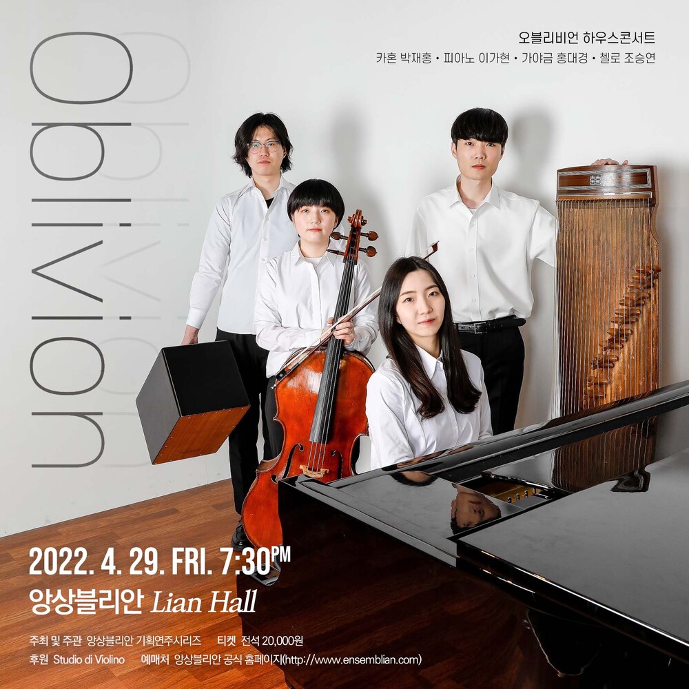 피아노, 첼로, 카혼 그리고 가야금으로 이루어진 독특한 편성의 앙상블 Oblivion(오블리비언)입니다. 카혼과 가야금까지 더해진 이 팀의 음악은 어떤 소리가 날까요? 포레, 피아졸라 곡부터 토이스토리와 토토로의 OST까지 다양한 스펙트럼의 레퍼토리로 관객을 찾아옵니다. 지금 만나보세요.