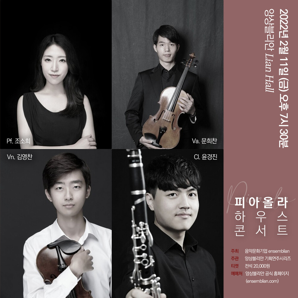 앙상블 피아올라는 피아노, 바이올린, 비올라, 클라리넷을 기본으로 관객 참여형 소통 프로그램을 기획하고 공연하는 앙상블 팀입니다. 이번 공연에서도 연주곡 사이 해설과 함께 관객이 연주에 흠뻑 몰입할 수 있는 다양한 요소들이 숨어있는데요. 모차르트와 차이코프스키 음악이 함께 하는 2월. 앙상블 피아올라와 함께 만나보세요 :)