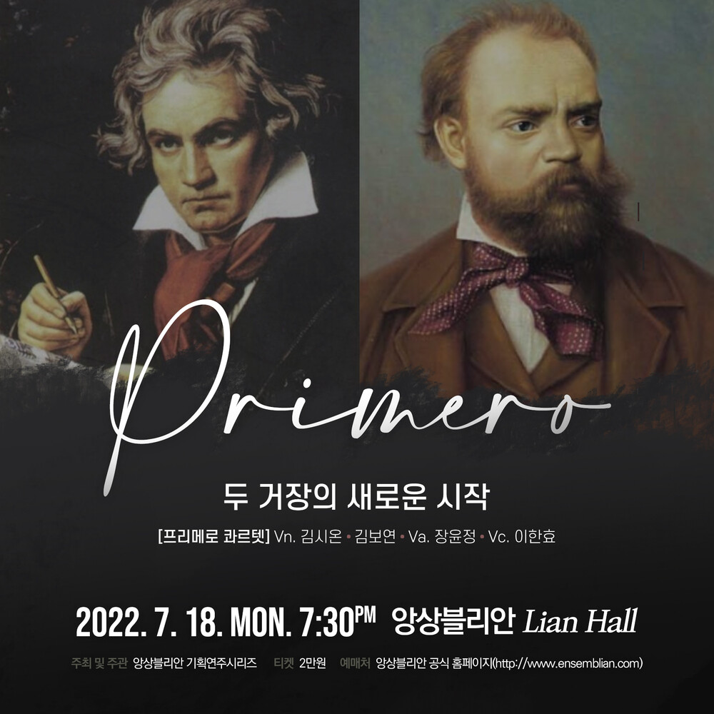 프리메로는 스페인어로 첫번째라고 합니다. 신앙을 가지고 있는 네 연주자는 성경에서 말하는 첫 열매에 큰 의미를 두고 있습니다. 추수 때 수확하는 첫 번째 열매, 가장 좋은 연주로 하나님과 청중을 영화롭게 하는 앙상블이 되고자 하는 마음을 담은 연주. 두 거장의 새로운 시작을 앙상블리안에서 만나보세요.