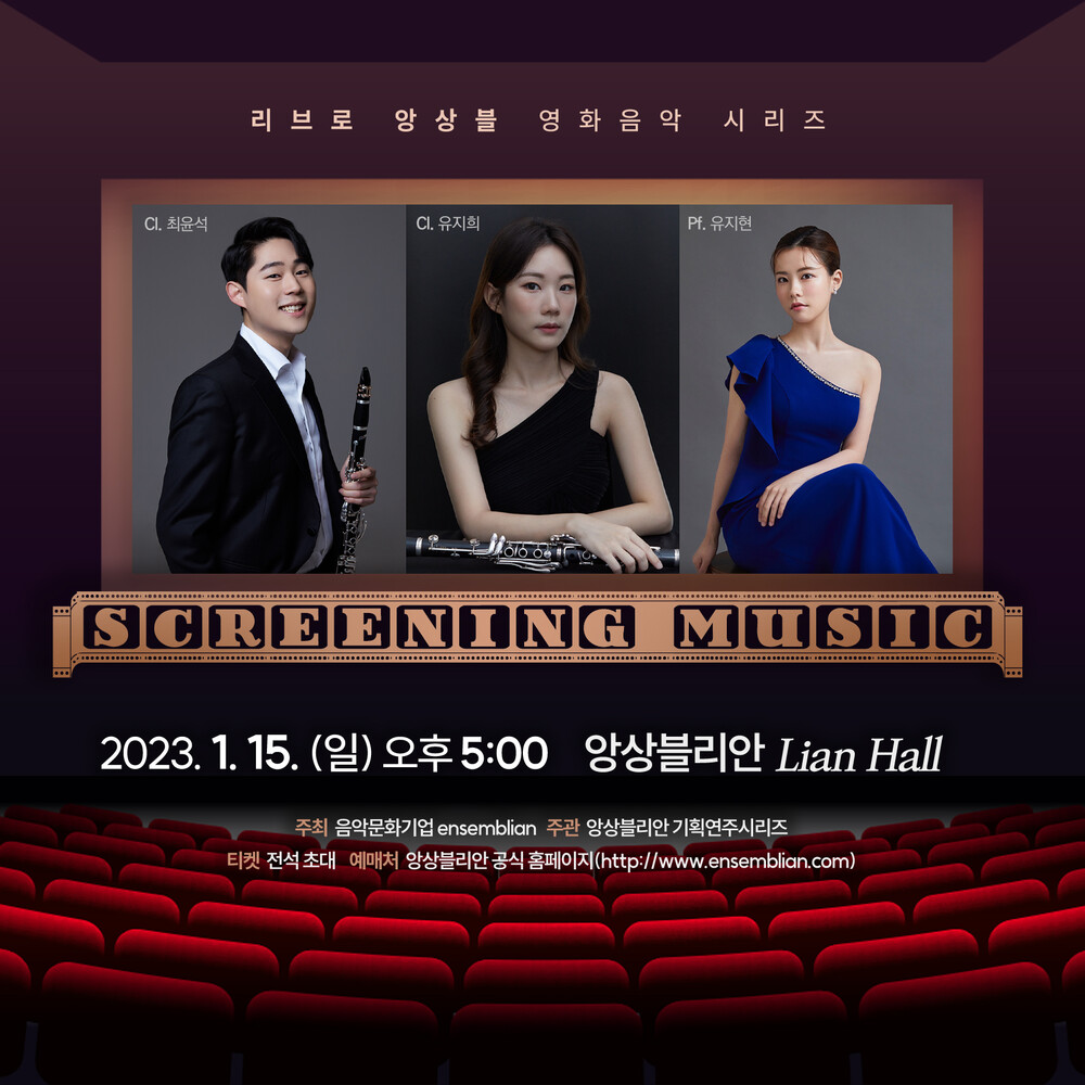'영화 음악'하면 제일 먼저 떠오르는 곡이 있으신가요? 아마 이번 콘서트에 그 곡들이 모두 담겨있을 것 같습니다. 2022년에 이어 2023년에도 찾아온 클라리넷&피아노 트리오 '리브로 앙상블'이 2023 두번째 공연으로 찾아옵니다. 클라리넷과 피아노의 조합으로 들려드리는 즐거운 공연, 홈페이지를 통해서 초대 티켓을 선착순으로 만나보실 수 있습니다!