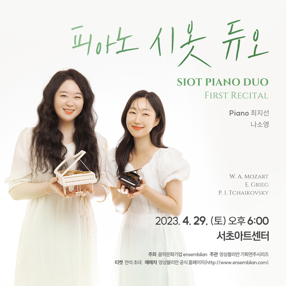 이름에 시옷이 들어가는 두 피아니스트의 만남! 시옷 듀오의 첫번째 콘서트입니다. 모차르트의 피아노 소나타를 그리그에 의해 두 대의 피아노로 편곡한 작품들과 차이코프스키의 호두까기인형으로 만나는 이번 연주는 2피아노 4핸즈로 진행되는데요. 이번 공연은 앙상블리안이 아닌 서초아트센터에서 함께 합니다. 두 연주자가 들려주는 두 대의 피아노 이야기, 앙상블리안과 함께 서초아트센터에서 만나보세요.