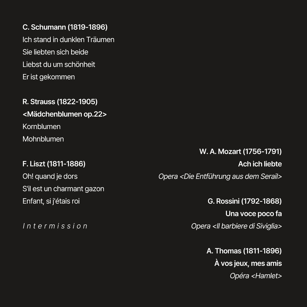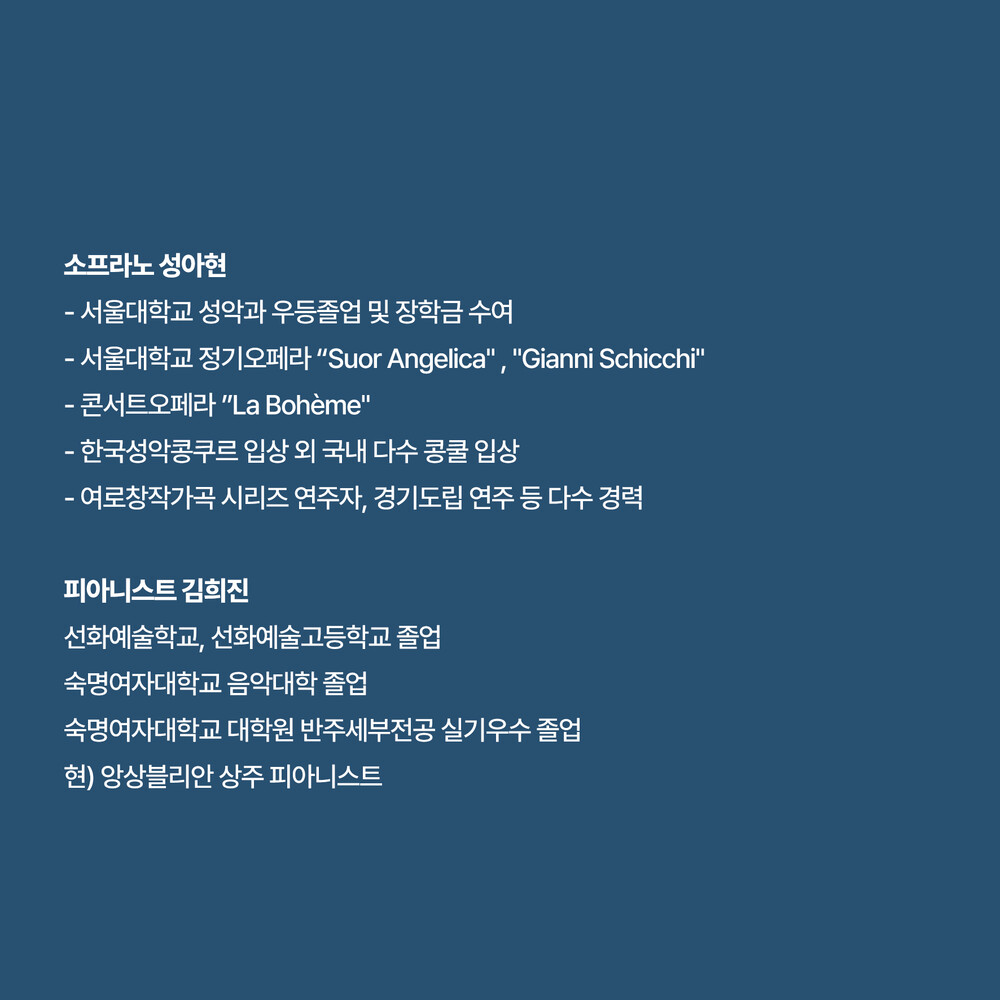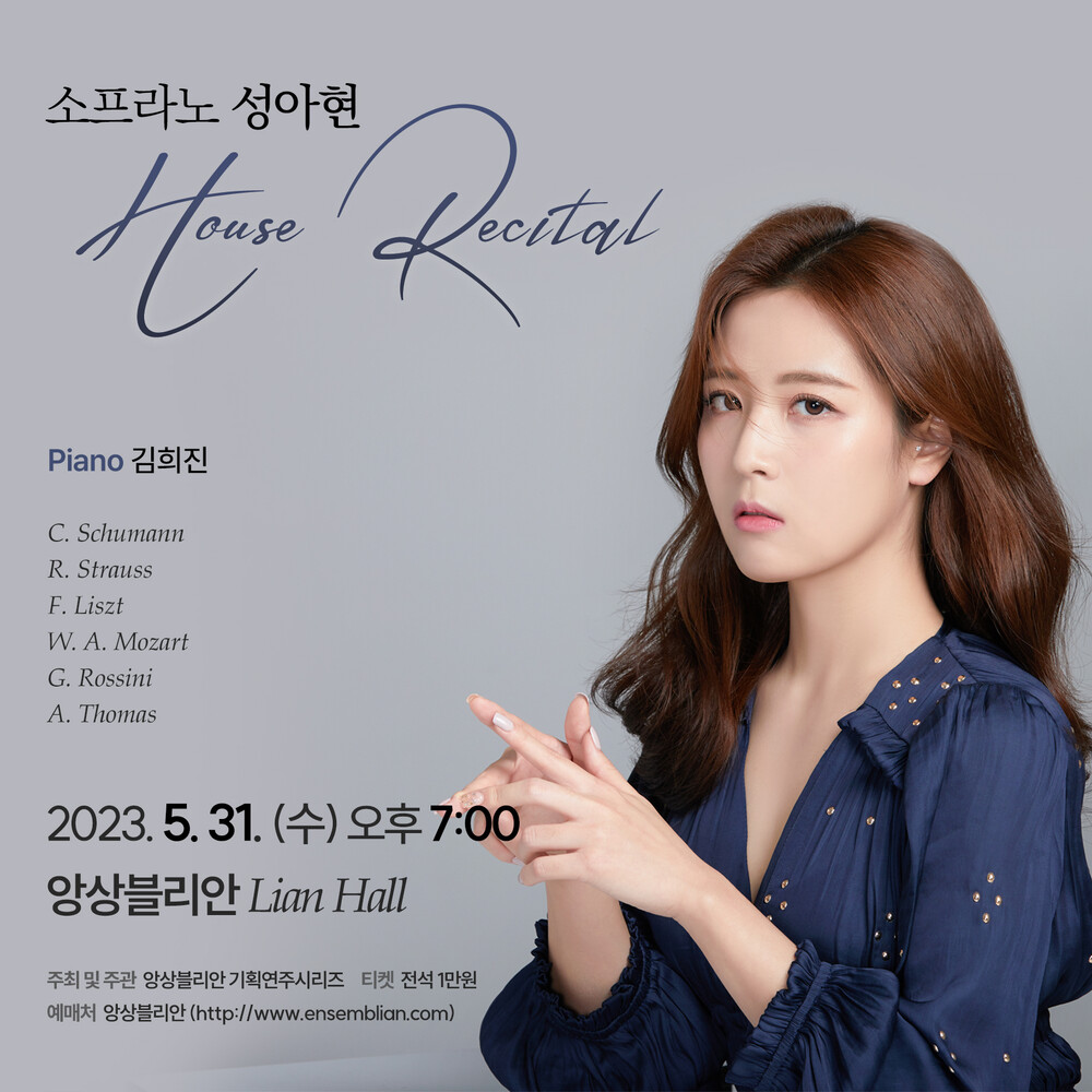 서울대학교 성악과 우등졸업 후 다양한 활동으로 성장하고 있는 소프라노 성아현의 리사이틀입니다. 앙상블리안 상주 피아니스트 김희진과 함께하는 이번 공연은 클라라 슈만, 슈트라우스, 리스트의 가곡 작품과 모차르트, 롯시니, 토마스의 아리아로 함께 합니다. 앙상블리안에서 만나보세요.