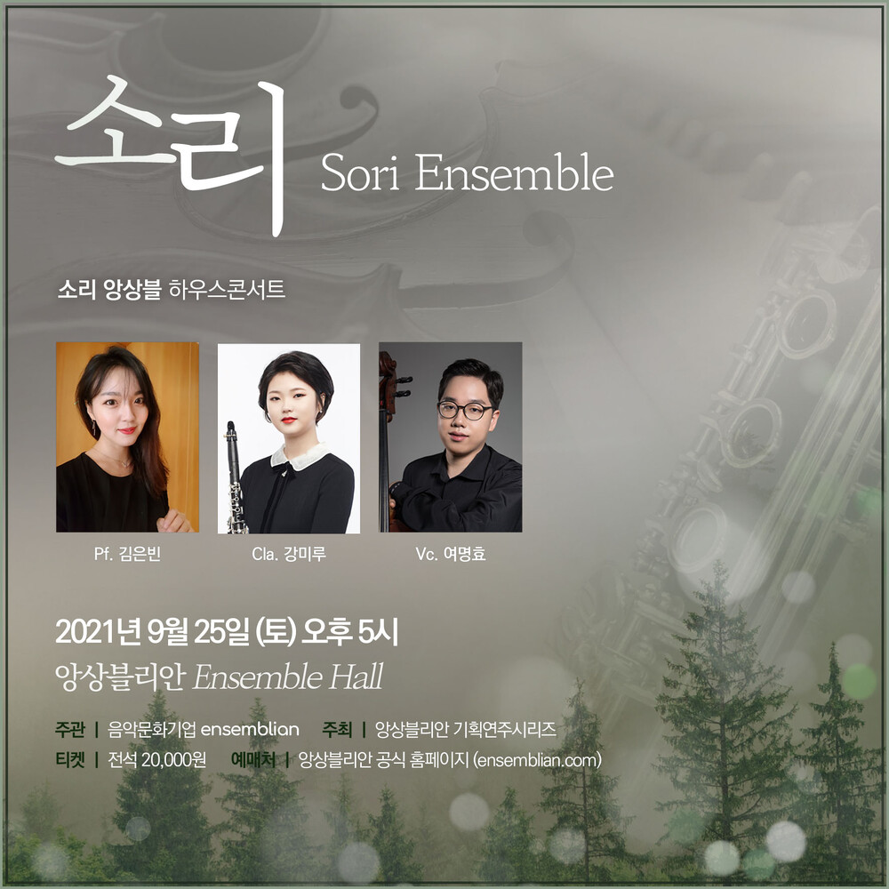 클라리넷과 첼로 피아노로 이루어진 소리 앙상블의 콘서트입니다. 트리오로 인연을 맺은 소리 앙상블은 마음 맞는 연주자들이 함께 하며 음악으로 소통하는 팀입니다. 베토벤과 브람스의 클라리넷 트리오 작품을 연주하는 이번 콘서트에서 연주자들의 앙상블을 함께 느껴보세요.