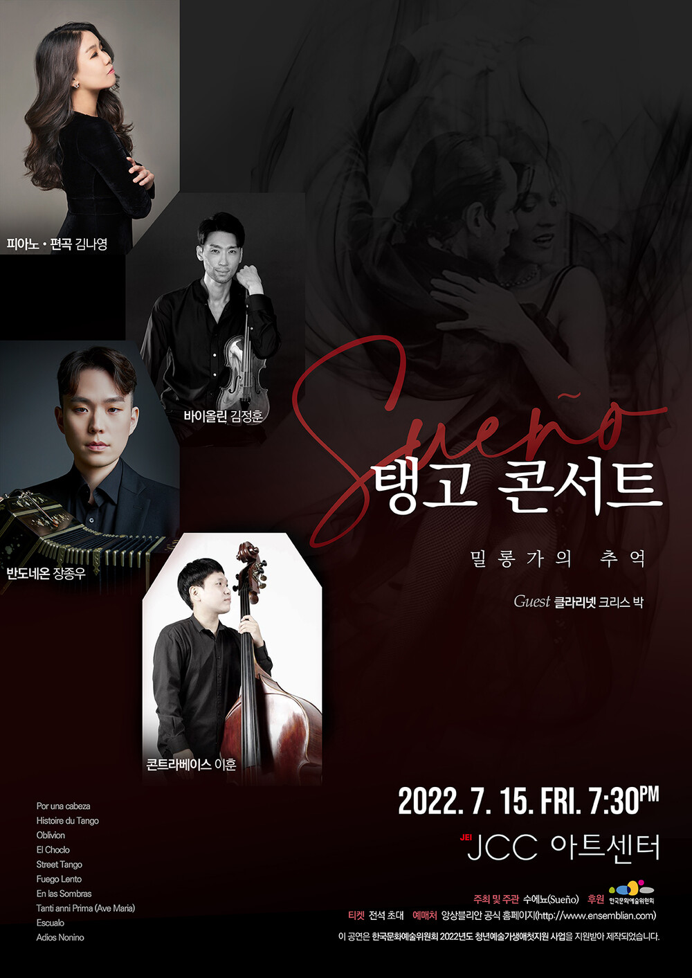 수에뇨(Sueño)는 독일, 미국, 한국에서 공부한 젊은 연주자들이 만나 창단된 단체로 아르헨티나의 탱고를 클래식적인 요소와 융합하여 <클래식컬 탱고> 라는 장르를 창작하고 실연하는 팀입니다.