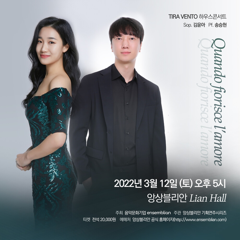 소프라노 김윤아와 피아니스트 송승현이 함께 하는 TIRA VENTO(띠라벤또)의 하우스콘서트입니다. 이태리, 한국, 영미가곡과 함께 프랑스 오페라 아리아들을 만나볼 수 있는 이번 콘서트에서는 많은 분들의 사랑을 받는 이원주의 연, 정환호의 꽃 피는 날을 비롯하여 최근 타계한 미국 작곡가 아르젠토의 6개의 엘리자베스 시대의 노래를 들으실 수 있습니다. 이번 공연 역시 유튜브 스트리밍과 함께 합니다.