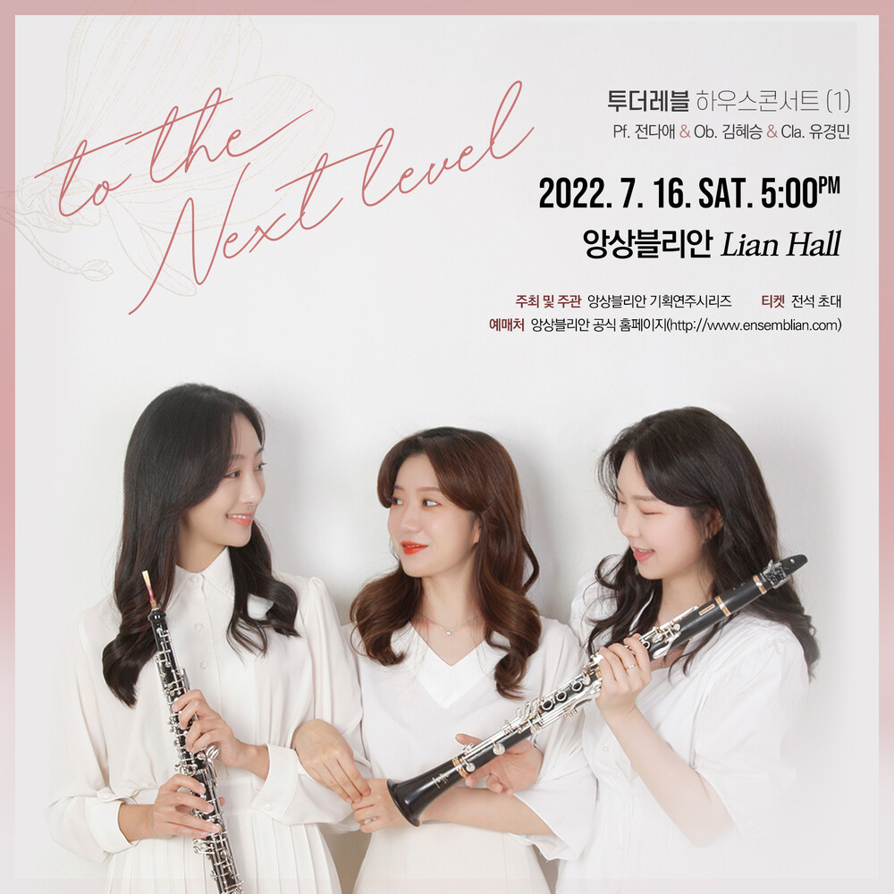 to the next level의 줄임말인 앙상블 투더레블은 피아노, 오보에, 클라리넷이라는 악기와 함께 삶을 살아가는 각기 다른 성향의 연주자들이 만나 다음 단계를 향해 항상 끊임없이 탐구하며 나아가자 라는 뜻을 담고 있다고 합니다. 한국과 독일에서 겪은 각자의 삶을 음악으로 나누며, 음악을 통해 배우고 느끼며 여행하던 그 순간을 관객에게 전달하며 여운을 지속시키기 위해 노력하는 팀입니다. 투더레블의 도약을, 앙상블리안의 아담한 리안홀에서 만나보세요.