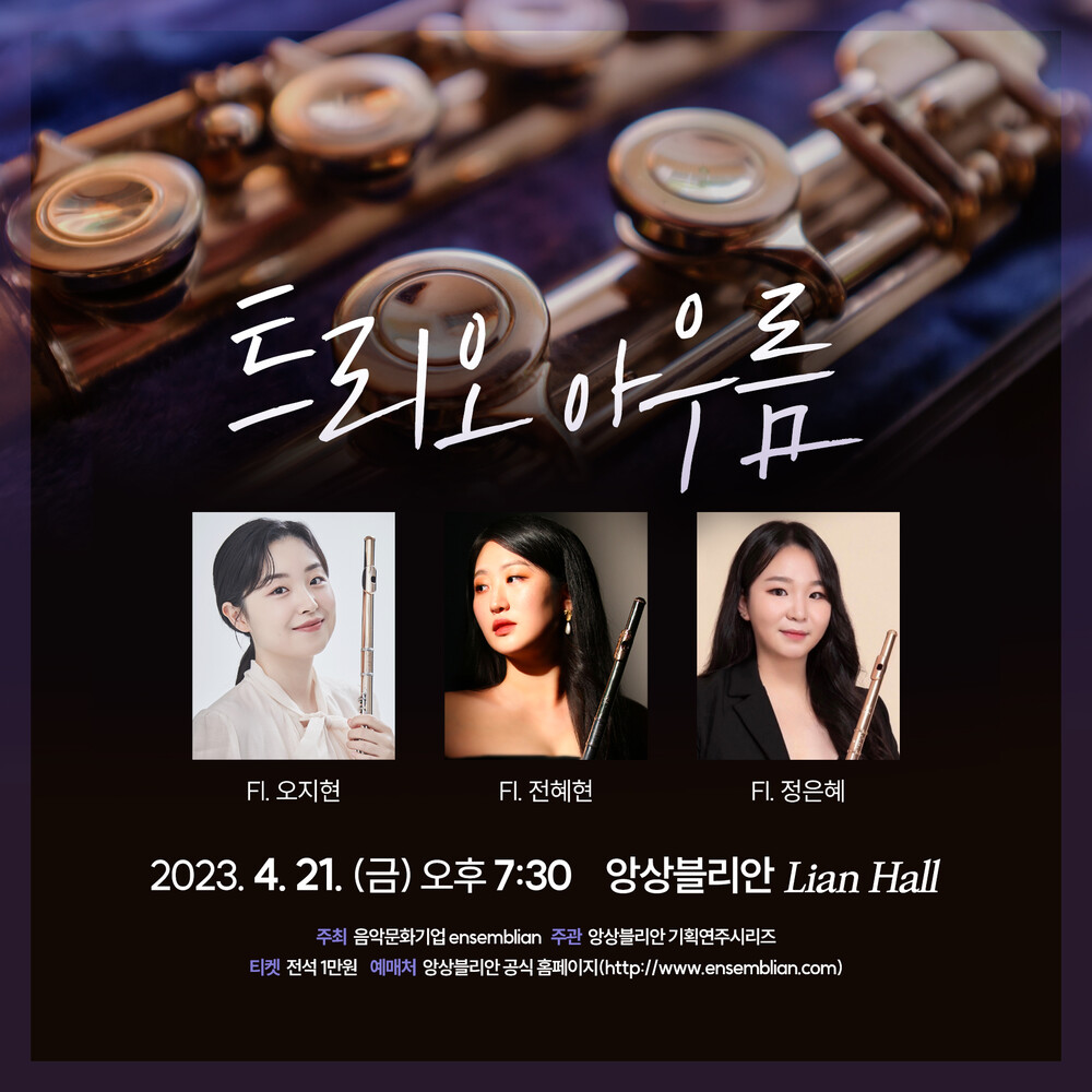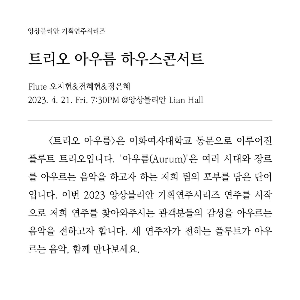 <트리오 아우름>은 이화여자대학교 동문으로 이루어진 플루트 트리오입니다. '아우름(Aurum)'은 여러 시대와 장르를 아우르는 음악을 하고자 하는 저희 팀의 포부를 담은 단어입니다. 이번 2023 앙상블리안 기획연주시리즈 연주를 시작으로 저희 연주를 찾아와주시는 관객분들의 감성을 아우르는 음악을 전하고자 합니다. 세 연주자가 전하는 플루트가 아우르는 음악, 함께 만나보세요.