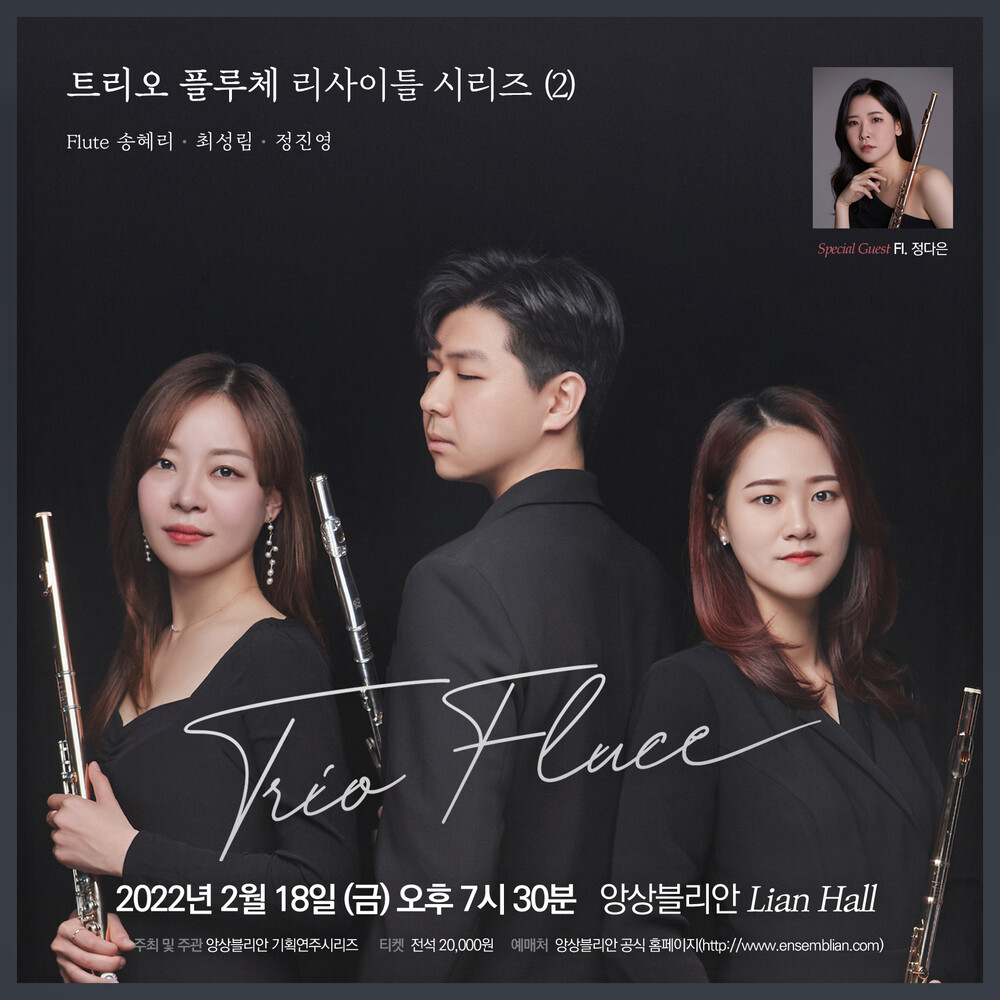 플루트 트리오 플루체의 두 번째 하우스콘서트입니다. 지난 공연에서 진중한 프로그램과 플루트 트리오의 다채로운 매력을 보여주는 구성으로 많은 분들께 호평을 받았던 플루체인데요. 독일 뉘른베르크 음대에서 함께 수학한 세 플루티스트와 함께 이번 공연에서는 특별히 스페셜게스트 정다은이 함께 하며 플루트 콰르텟까지 선보입니다. 앙상블리안 하우스콘서트에서 트리오 플루체를 만나보세요!