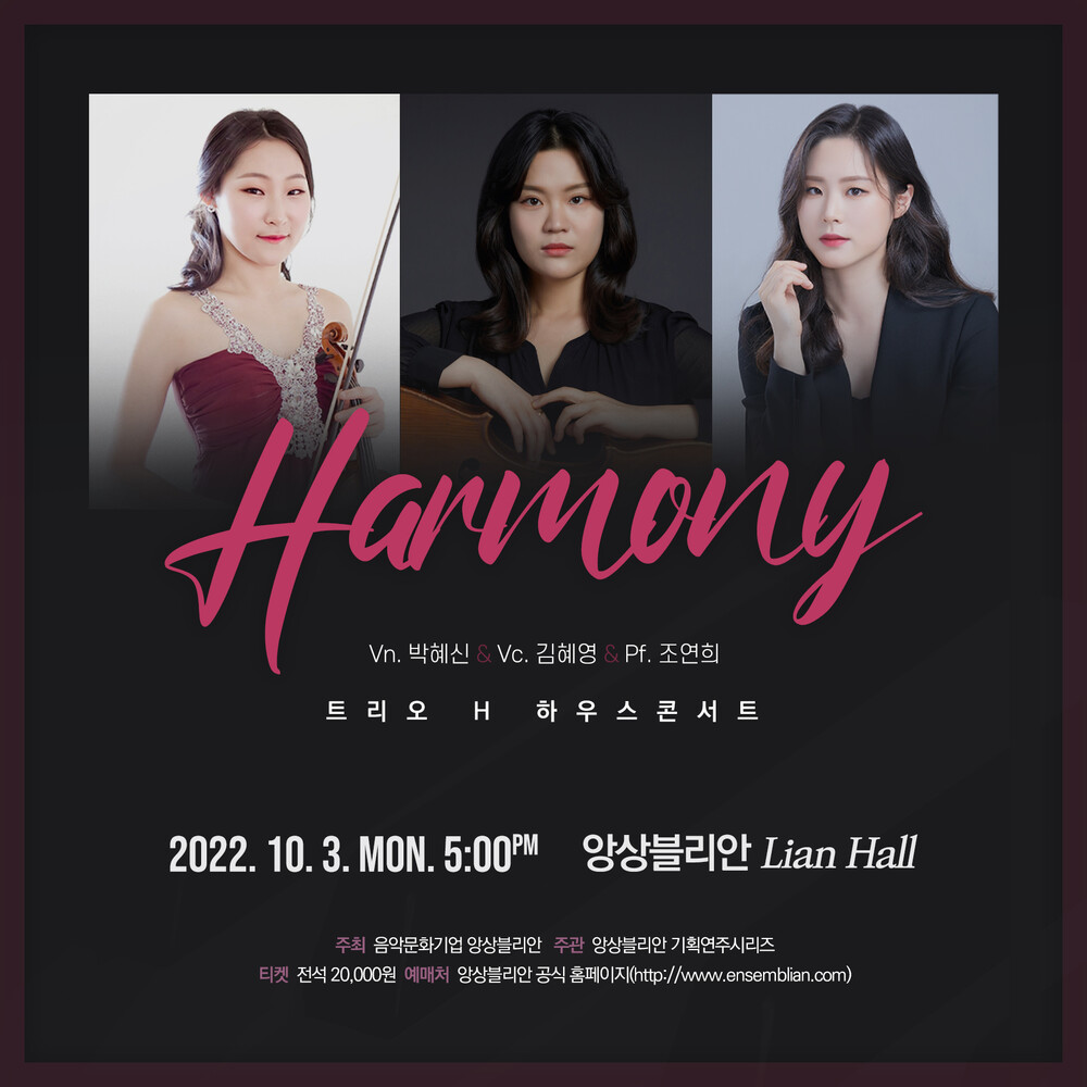바이올리니스트 박혜신, 첼리스트 김혜영, 그리고 피아니스트 조연희로 구성된 '트리오 H' 는 세 연주자의 공통 이니셜인 'H'를 팀명으로 정하고, '세 명의 소리를 하나로 모아 조화롭게 어우러진(Harmony) 아름다운 음악을 하자'는 마음으로 모인 팀입니다. 2019년 여름, 처음으로 호흡을 맞췄던 이들은 코로나19 팬데믹으로 인해 활동하지 못했지만, 드디어 3년만에 다시 만나 관객과의 시간을 갖게 되었는데요. 이번 앙상블리안에서의 연주를 시작으로 앞으로의 활동이 기대되는 '트리오 H'에게 큰 관심과 따뜻한 격려 부탁드립니다.