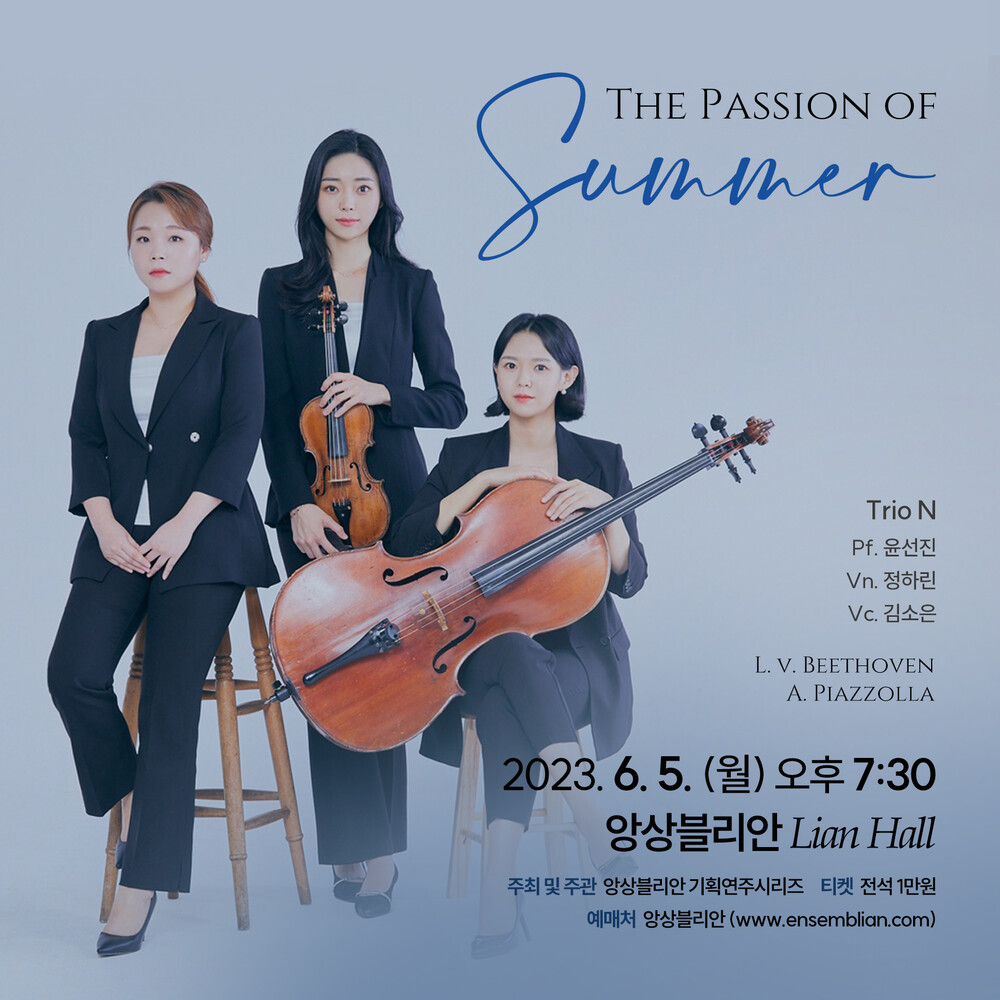 '트리오 N'은 피아니스트 윤선진, 바이올리니스트 정하린, 첼리스트 김소은으로 구성된 피아노 트리오 팀입니다. 한양대학교와 동대학원 동문으로 결성되었으며 현재 각자의 위치에서 오케스트라 및 실내악 연주자로서 다양한 활동을 하고 있습니다. Trio N(트리오 엔)은 트리오(Trio)와 '그리고(and)'를 뜻하는 'N'으로 우리, 그리고 음악. 즉 우리 곁에 항상 함께 할 음악을 연주하자는 트리오 N의 포부를 담고 있다고 하는데요. 특별히 트리오 N은 2021년, 2022년 영산양재홀 전문예술인육성시리즈에 선정되어 3차례 청중들과 소통하며 연주하였으며 앞으로도 많은 활동을 통하여 피아노와 바이올린, 첼로의 열정적이며 섬세하고 다채로운 연주로 청중들에게 다가갈 예정이라고 합니다. 베토벤과 피아졸라의 음악으로 하우스콘서트 관객을 만나는 트리오 N의 The Passion of Summer을 만나보세요.