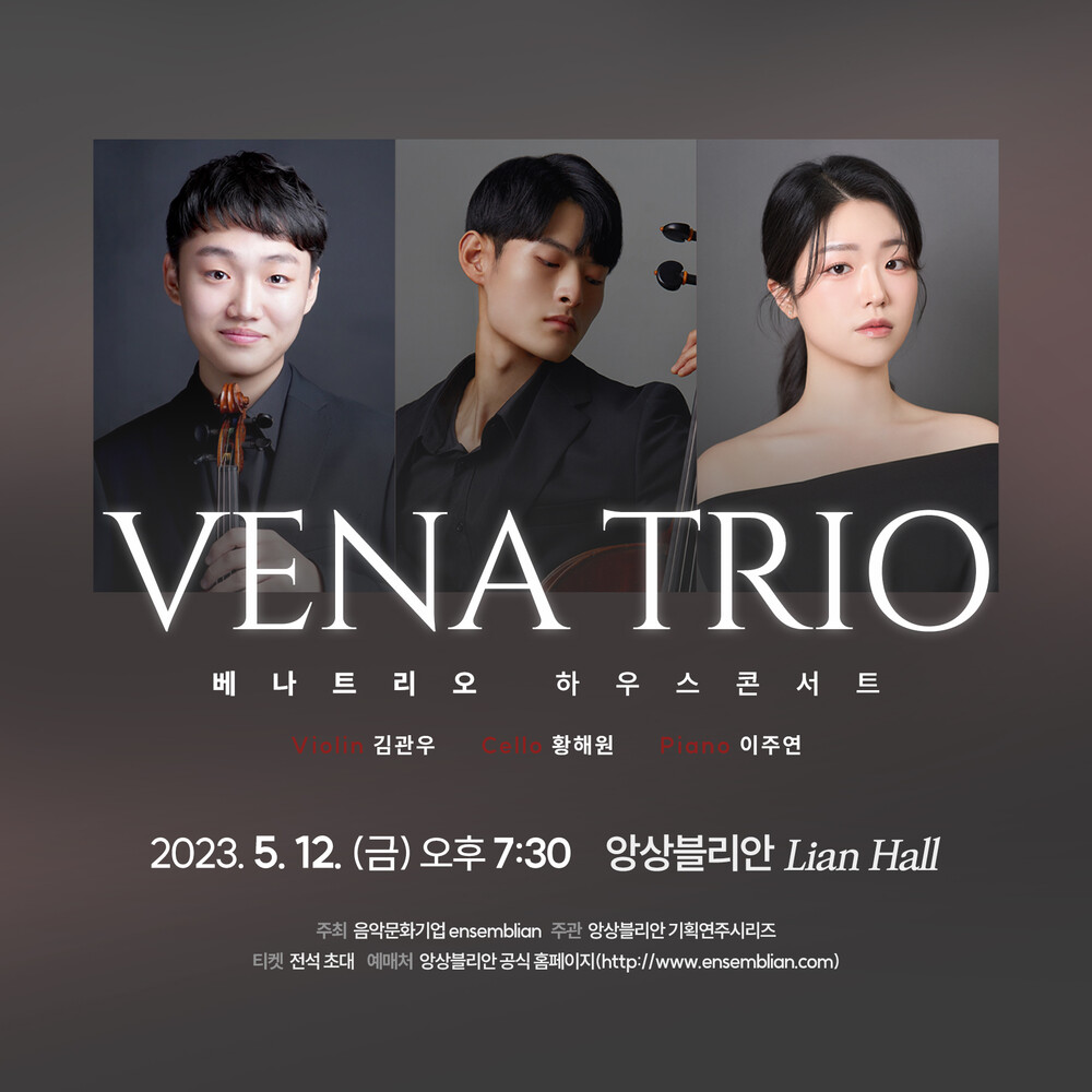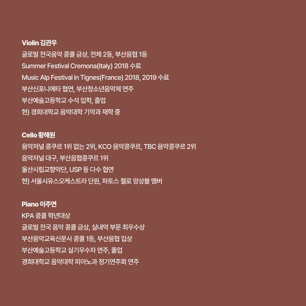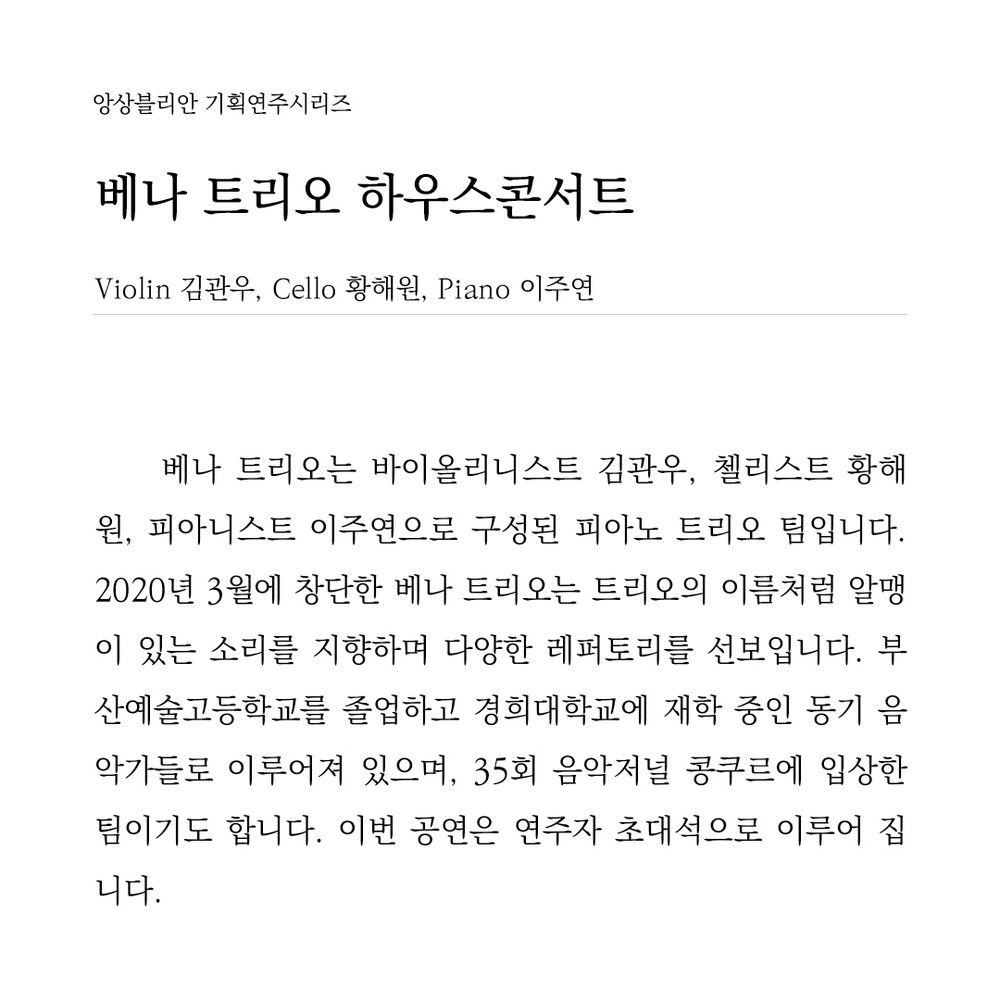 베나 트리오는 바이올리니스트 김관우, 첼리스트 황해원, 피아니스트 이주연으로 구성된 피아노 트리오 팀입니다. 2020년 3월에 창단한 베나 트리오는 트리오의 이름처럼 알맹이 있는 소리를 지향하며 다양한 레퍼토리를 선보입니다. 부산예술고등학교를 졸업하고 경희대학교에 재학 중인 동기 음악가들로 이루어져 있으며, 35회 음악저널 콩쿠르에 입상한 팀이기도 합니다. 이번 공연은 연주자 초대석으로 이루어 집니다.