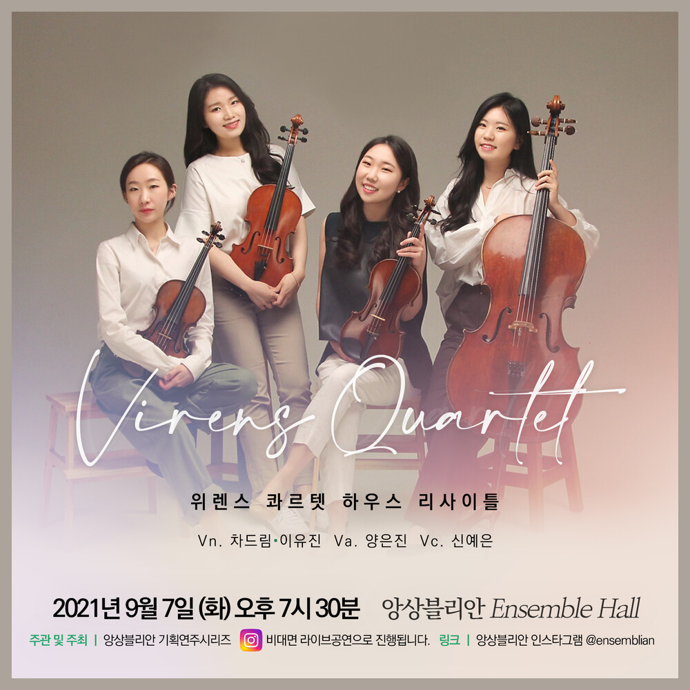 7월로 예정되어 있었던 위렌스 콰르텟의 하우스 콘서트입니다. 위렌스(vĭrens)는 '청년'이라는 뜻과 '푸른'이라는 뜻을 함께 지니고 있는데요. 푸르른 마음으로 음악을 노래하는 4명의 청년의 멜로디를 담았습니다. 유학을 떠나가 직전까지 함께 하며 콘서트를 준비하고 있는 이번 음악회. 위렌스 콰르텟의 하우스 리사이틀입니다.