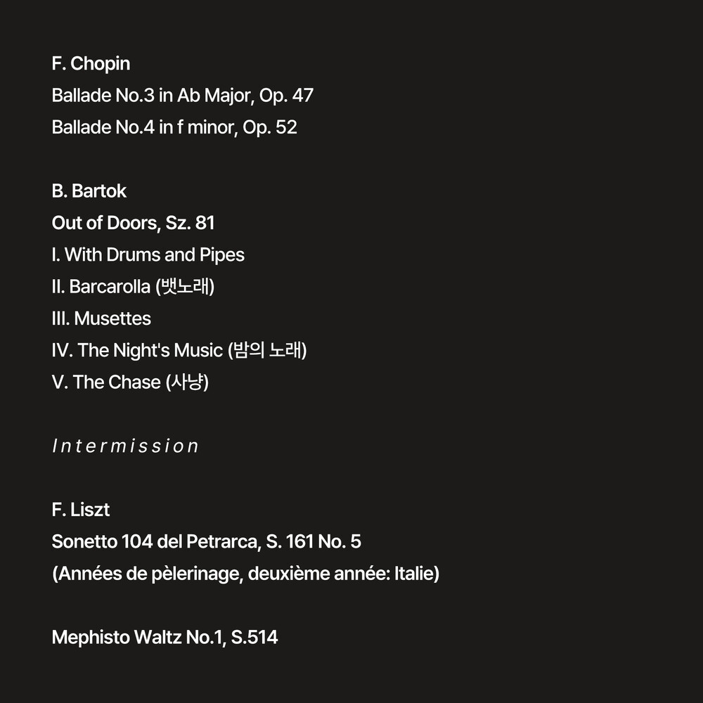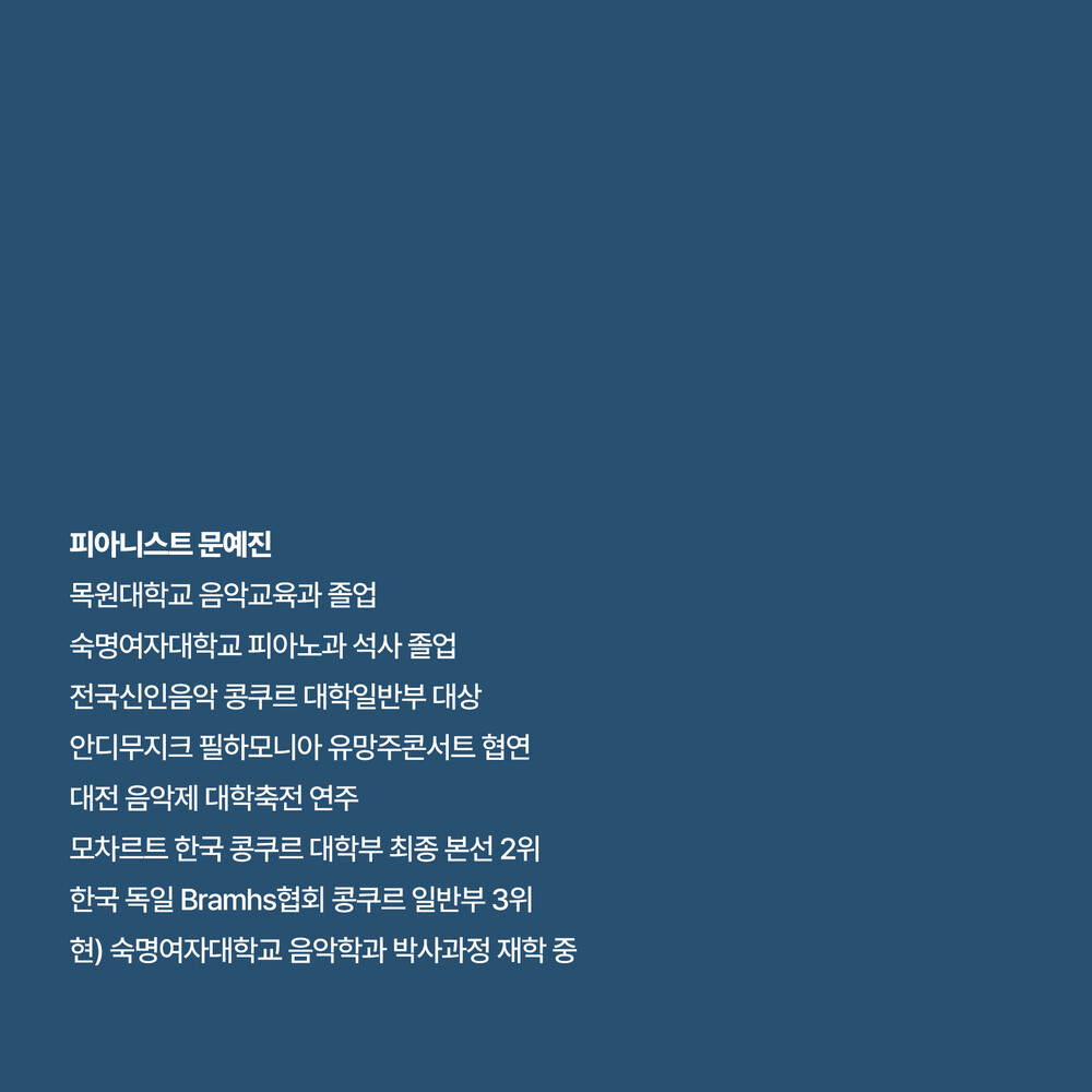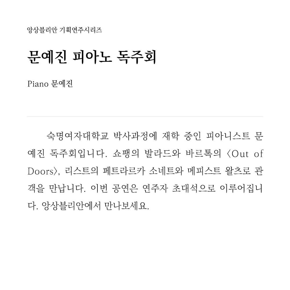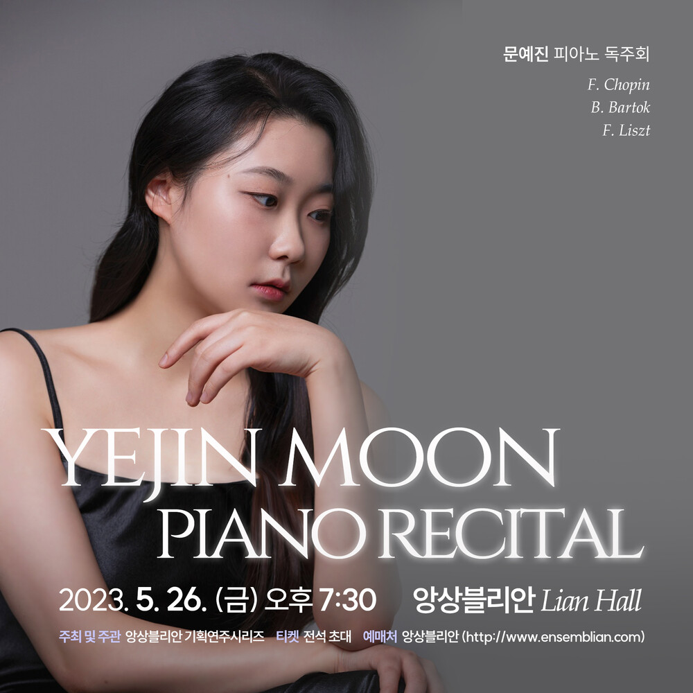 숙명여자대학교 박사과정에 재학 중인 피아니스트 문예진 독주회입니다. 쇼팽의 발라드와 바르톡의 <Out of Doors>, 리스트의 페트라르카 소네트와 메피스트 왈츠로 관객을 만납니다. 이번 공연은 연주자 초대석으로 이루어집니다. 앙상블리안에서 만나보세요.