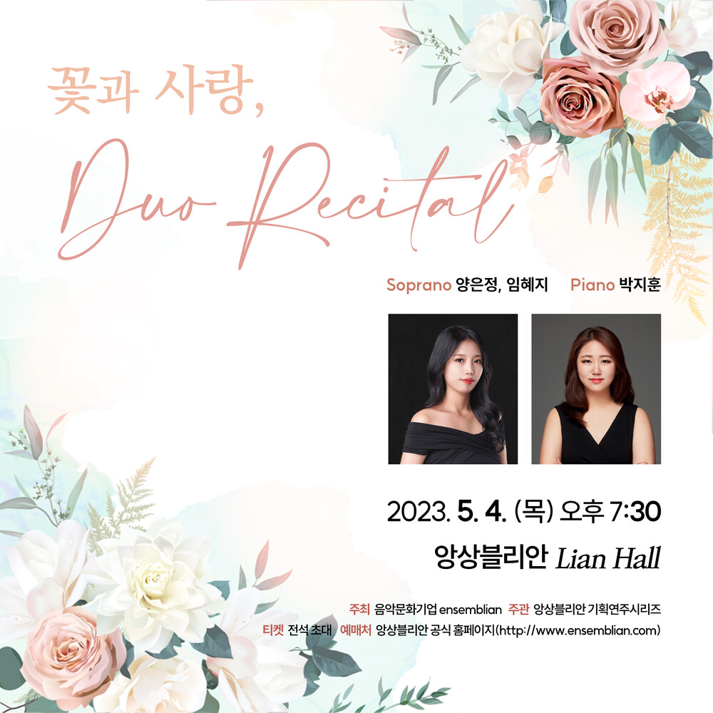 꽃과 사랑을 노래하는 두 소프라노 양은정과 임혜지의 듀오 리사이틀입니다. 두 연주자의 솔로 스테이지들과 피아니스트 박지훈의 연주로 함께 하는 이번 공연은 전석 초대로 진행됩니다. 봄날에 피어나는 꽃과 사랑의 가곡들, 앙상블리안에서 만나보세요.