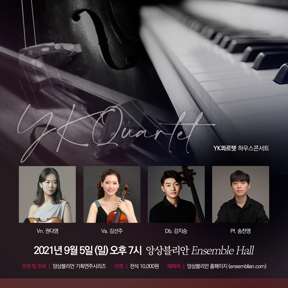 7월로 예정되었던 YK콰르텟의 콘서트입니다. 피아노 콰르텟의 편성을 띄고 있지만 독특하게도 첼로 대신 더블 베이스가 있습니다. 이번 콘서트에서는 다양한 장르를 아우르는 YK콰르텟 매력을 만나보실 수 있을텐데요. 작년에 서거한 엔니오 모리꼬네를 비롯하여 올해 탄생 100주년을 맞은 피아졸라까지. 의미있는 작곡가들을 기념함과 동시에 피아니스트의 섬세함을 담은 곡들도 포함되었답니다.